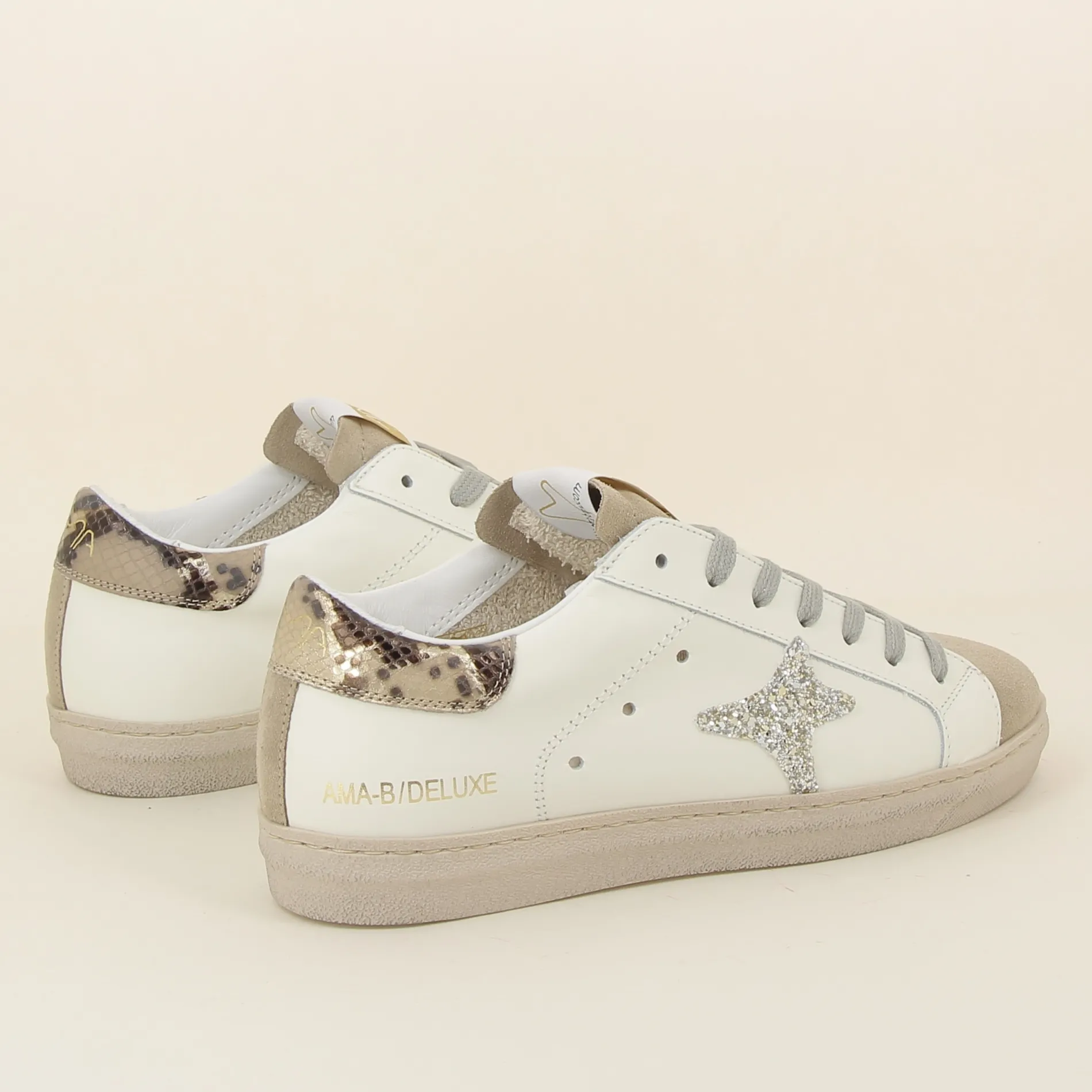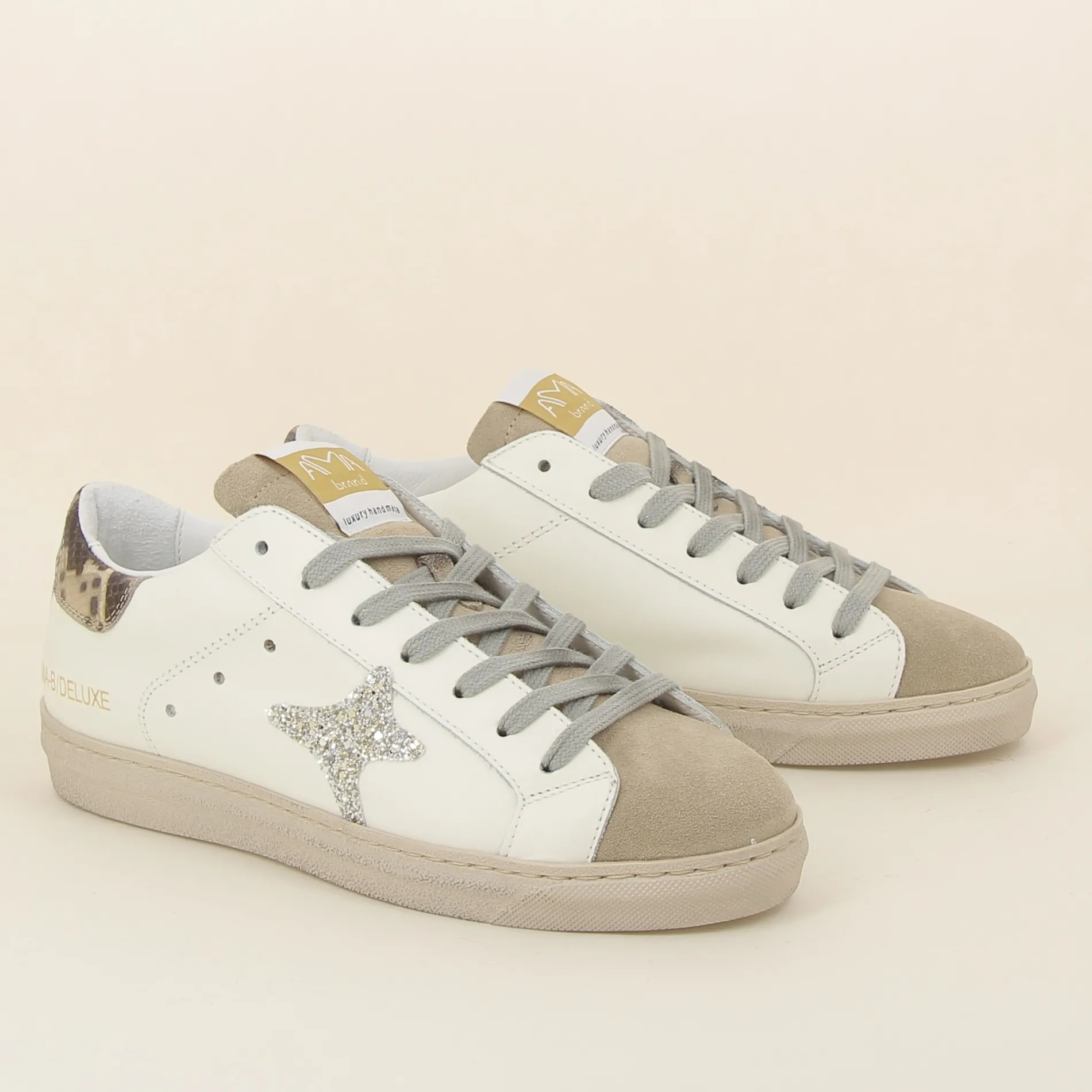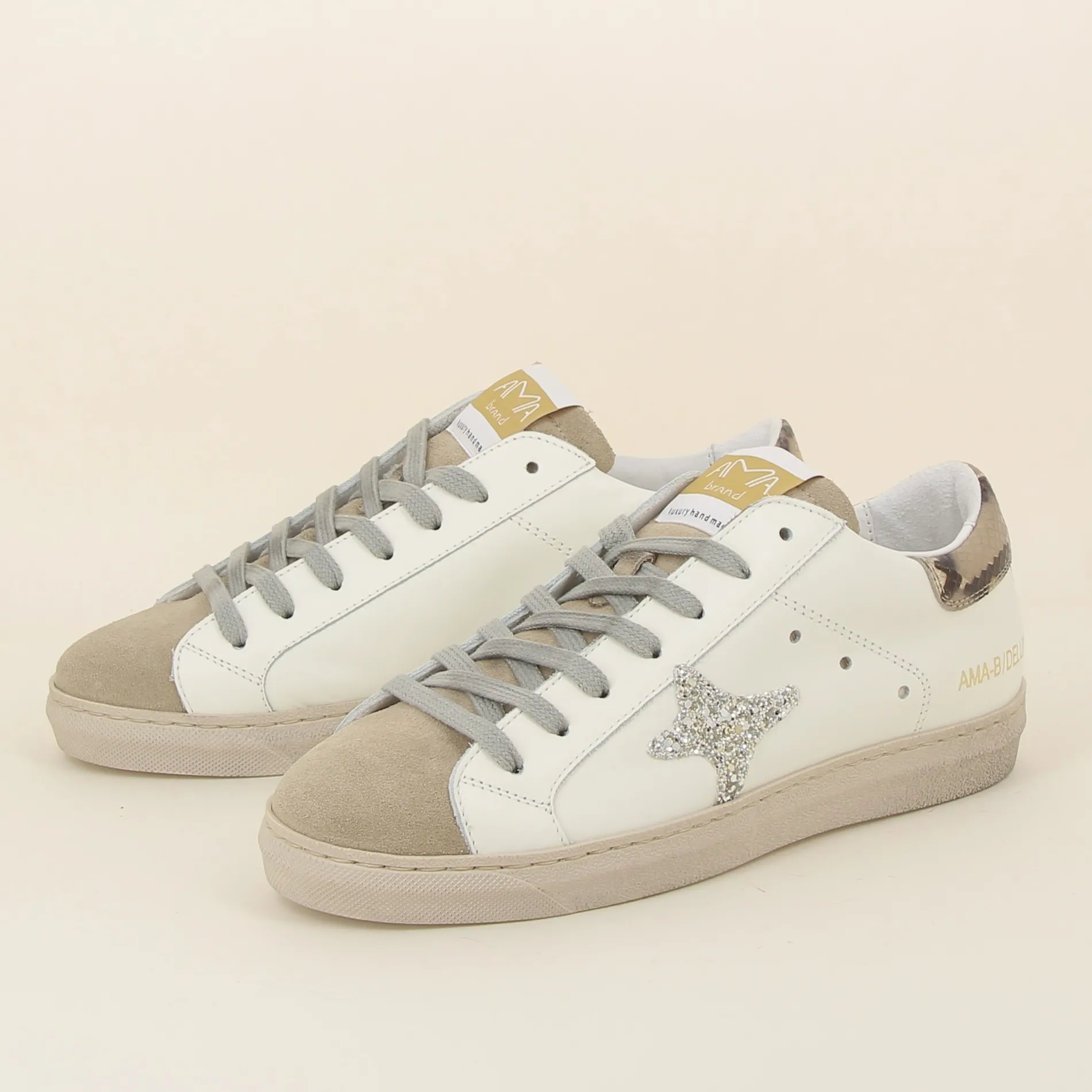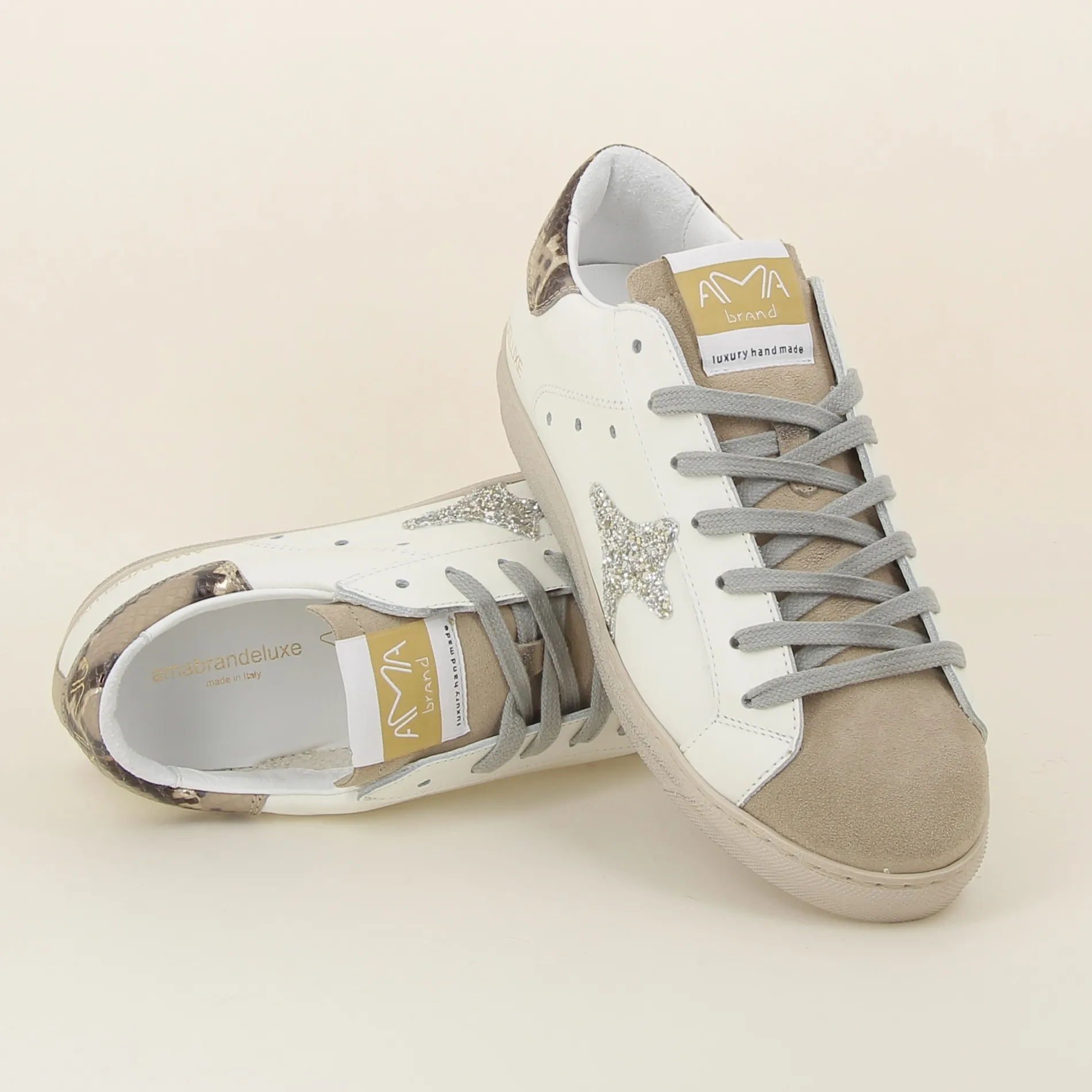 Pour cette paire de baskets blanches AMA BRAND en cuir avec empiècement en daim taupe et contrefort façon serpent, portez-les avec un pantalon cigarette noir et un haut en soie fluide dans une teinte neutre comme le beige ou le taupe. Pour ajouter une touche de sophistication, optez pour une veste blazer structurée et des bijoux argentés ou dorés, selon vos préférences.