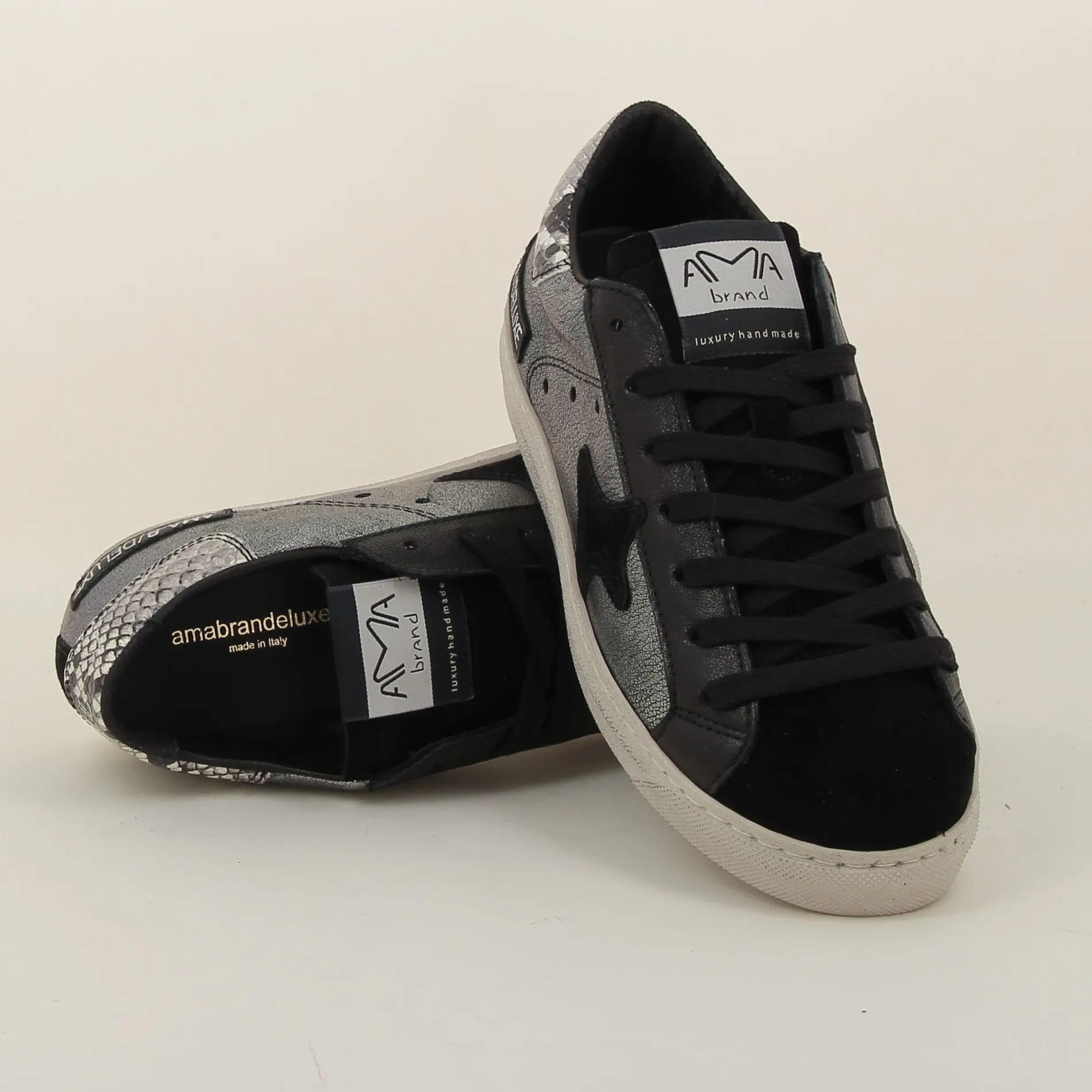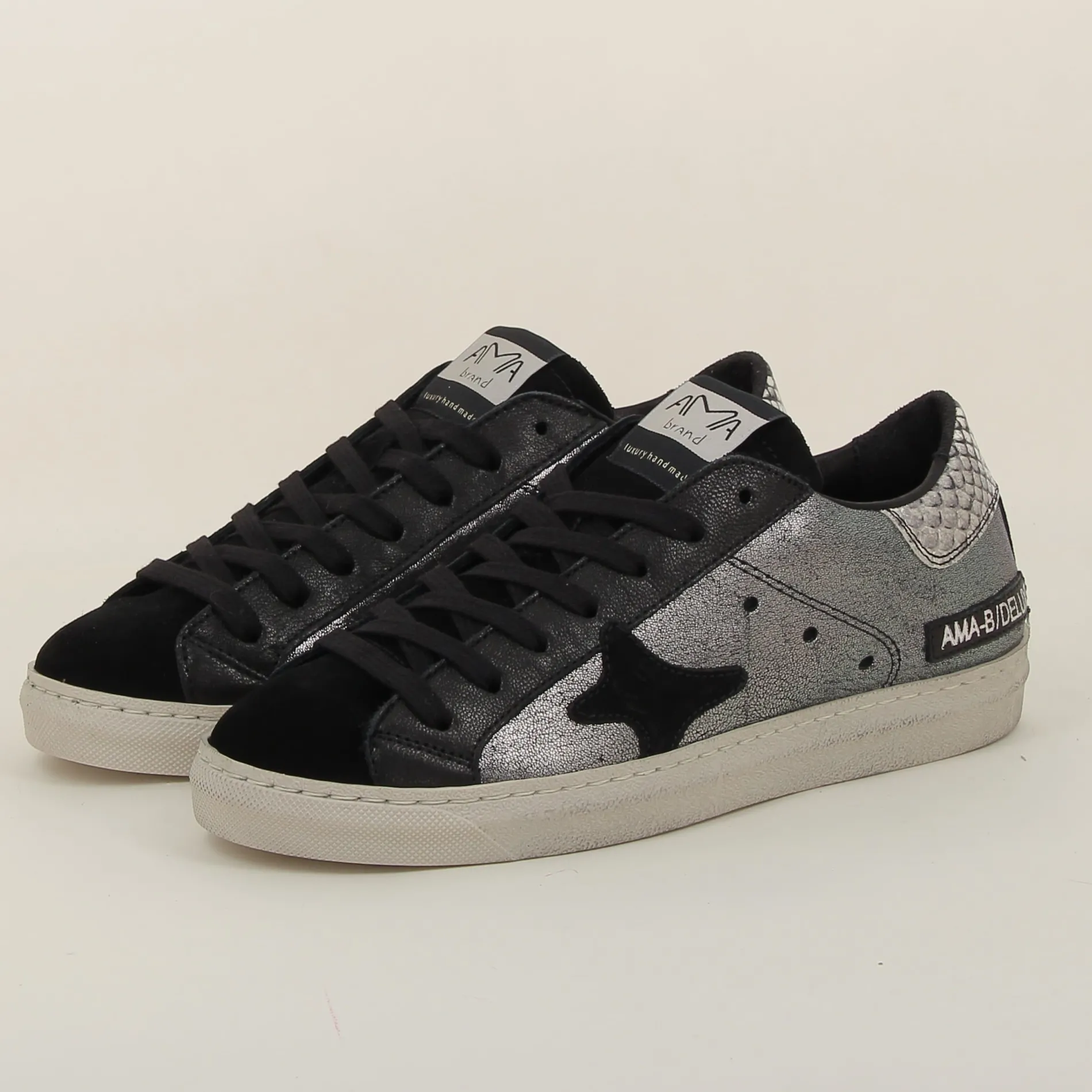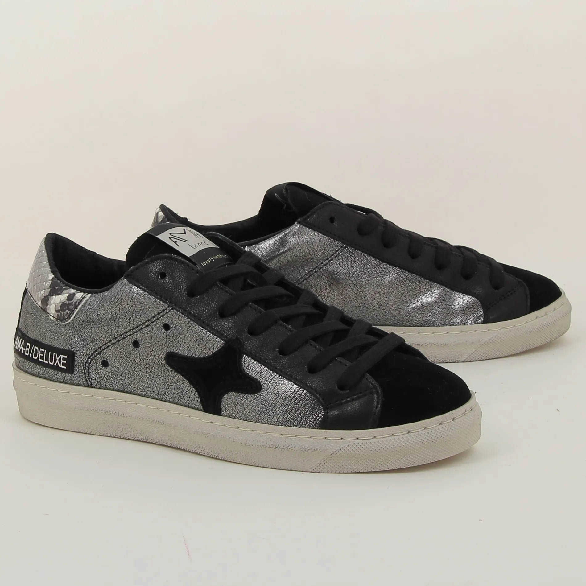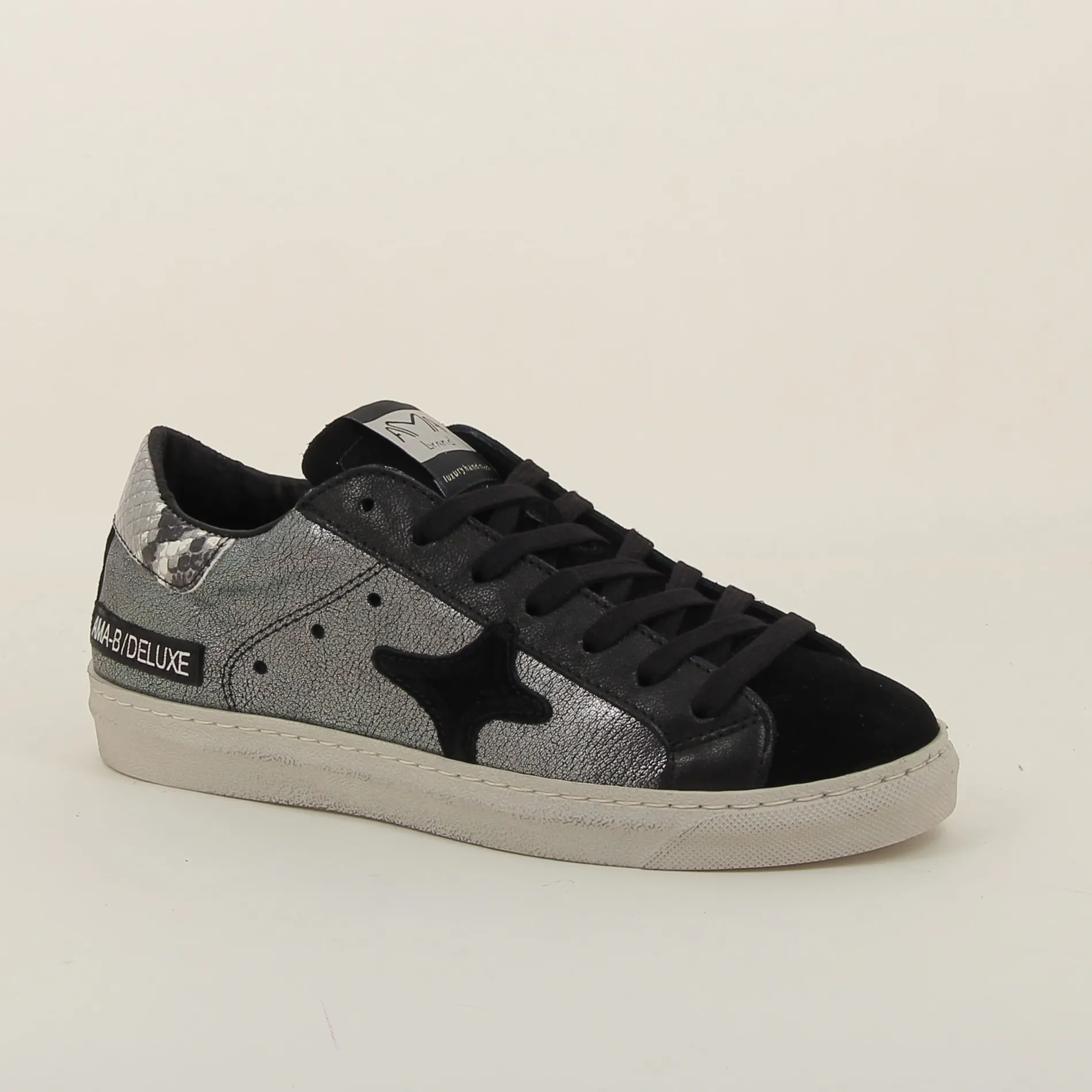 La Basket Ama-brand en cuir laminé argent et daim noir est un choix parfait pour ceux qui recherchent une chaussure alliant luxe et modernité.