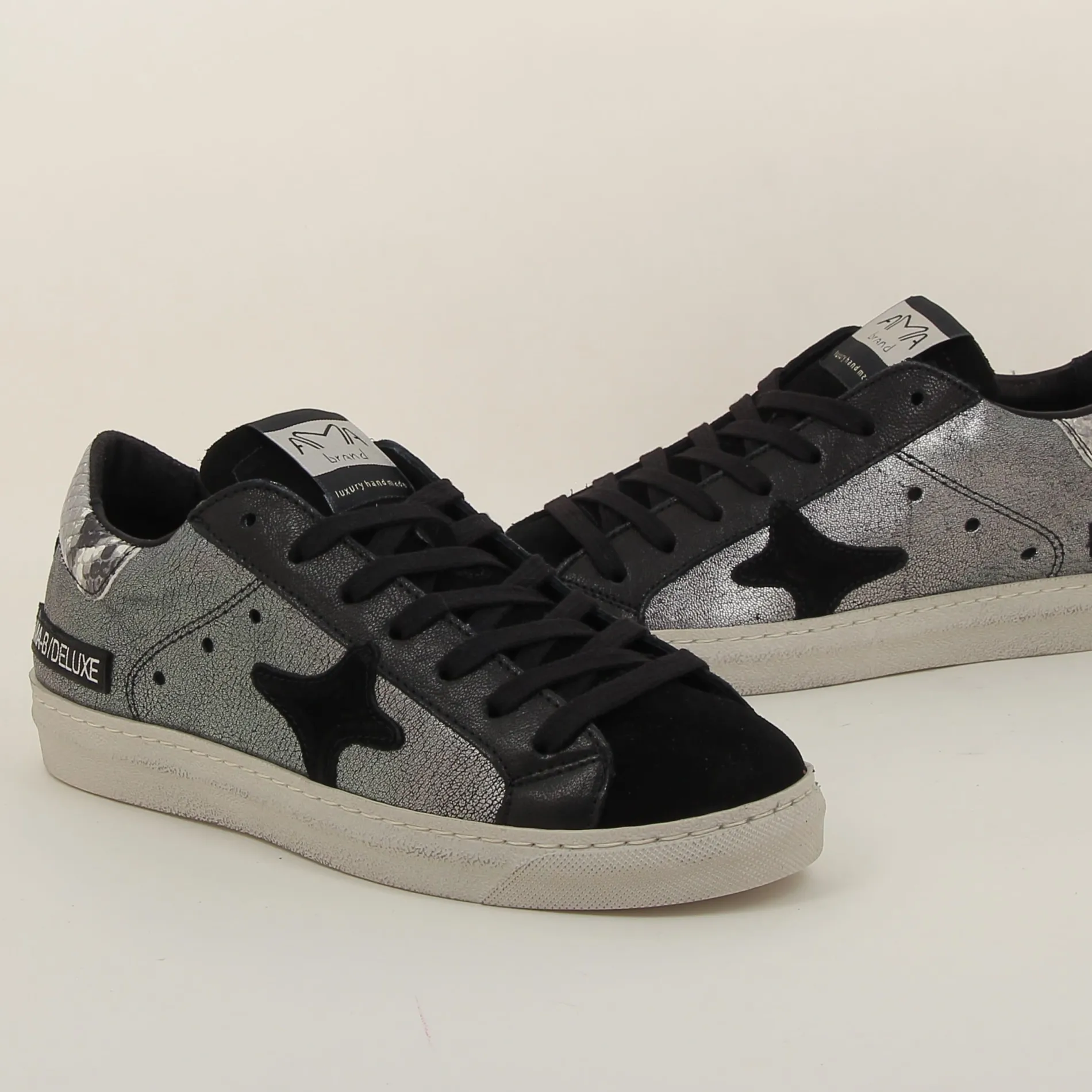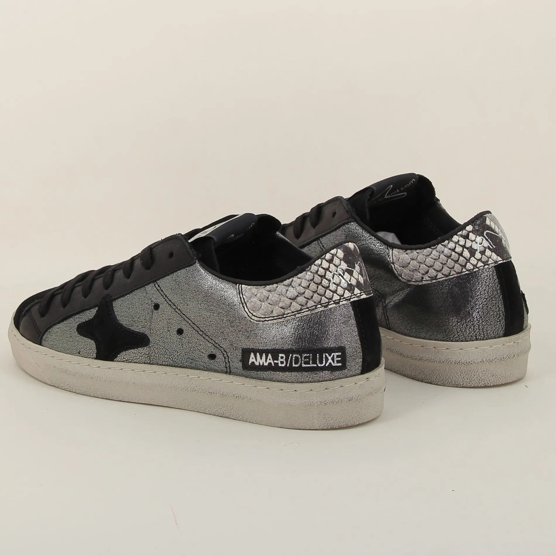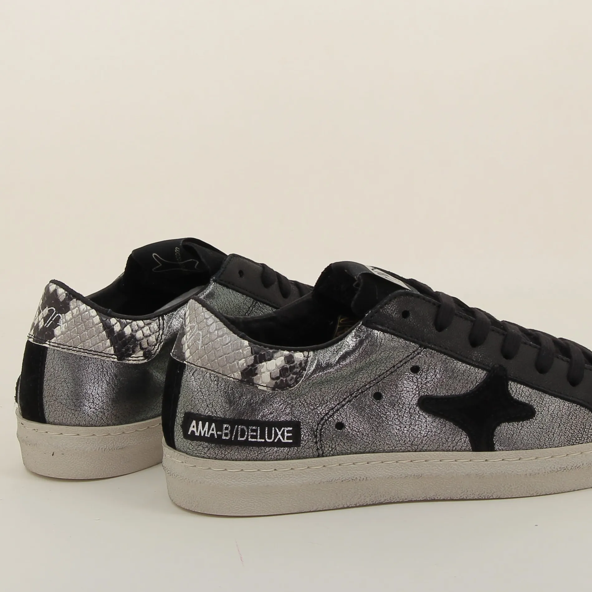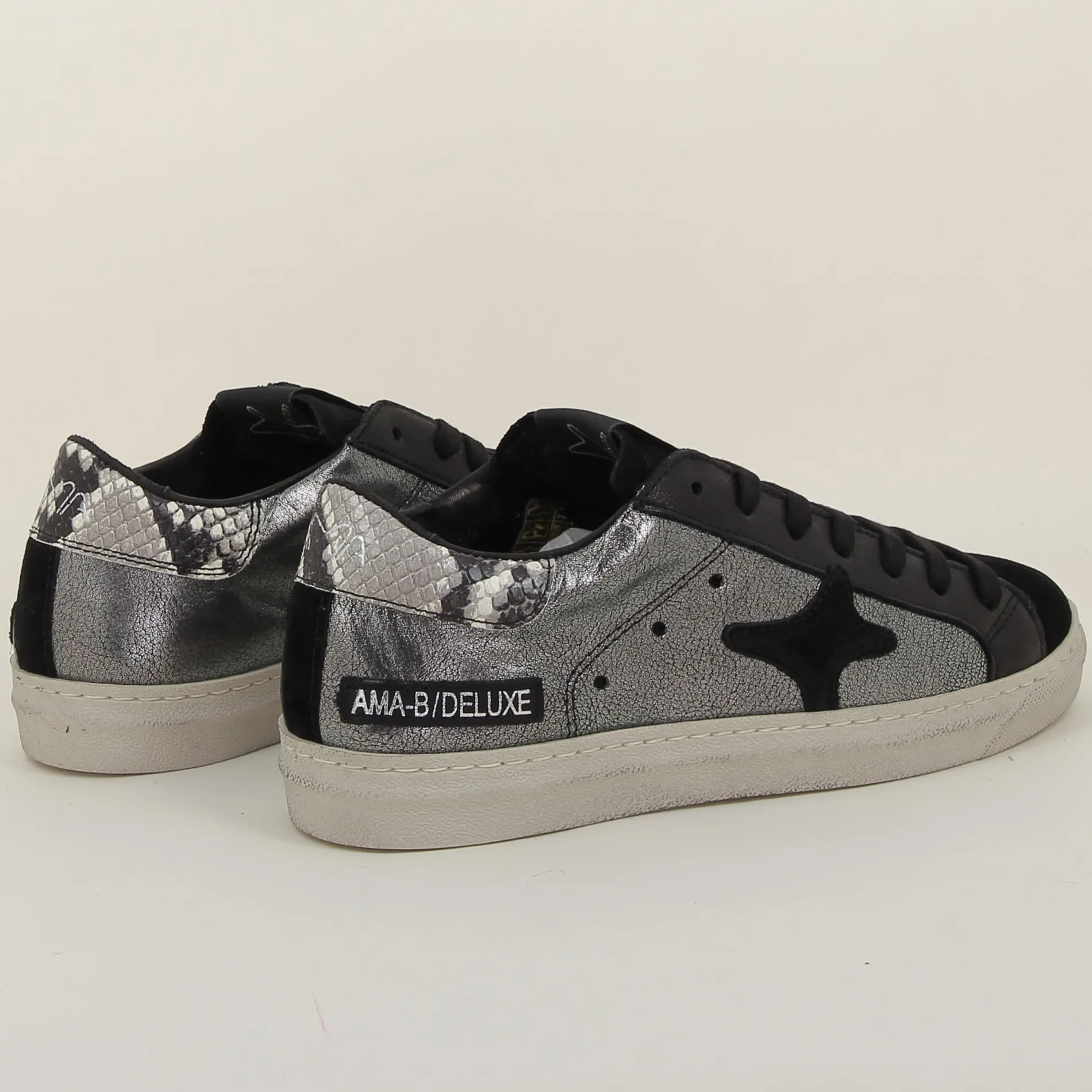 La Basket Ama-brand en cuir laminé argent et daim noir est un choix parfait pour ceux qui recherchent une chaussure alliant luxe et modernité.