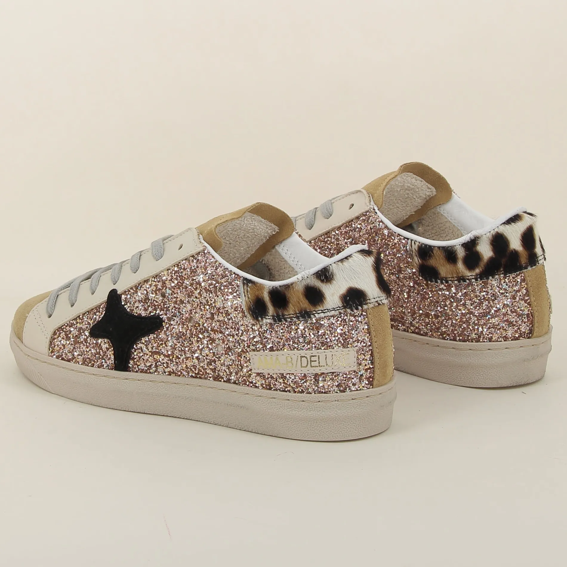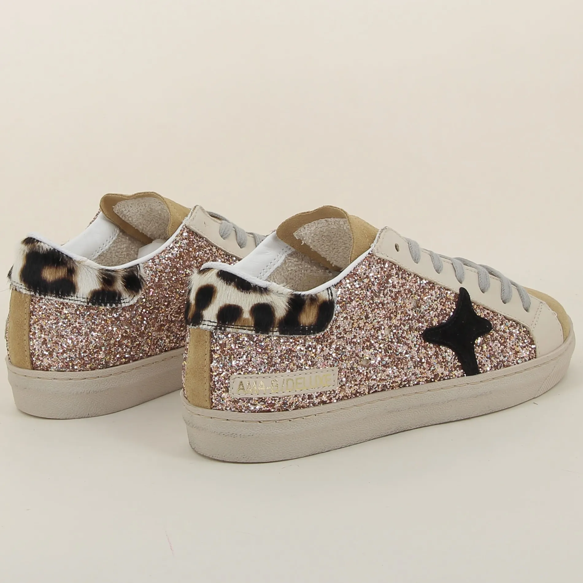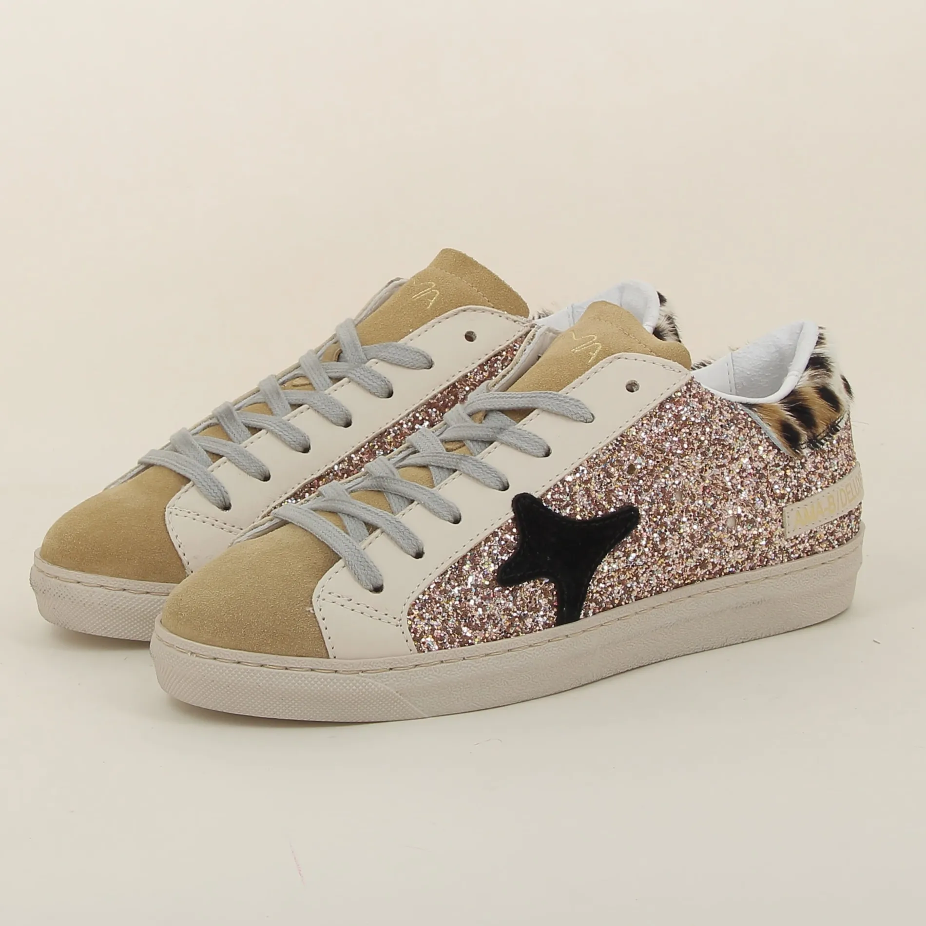 La Basket Ama-brand en glitter rose, avec ses détails en daim camel et cuir beige, est parfaite pour celles qui souhaitent allier confort, originalité, et éclat dans une chaussure au style inimitable.