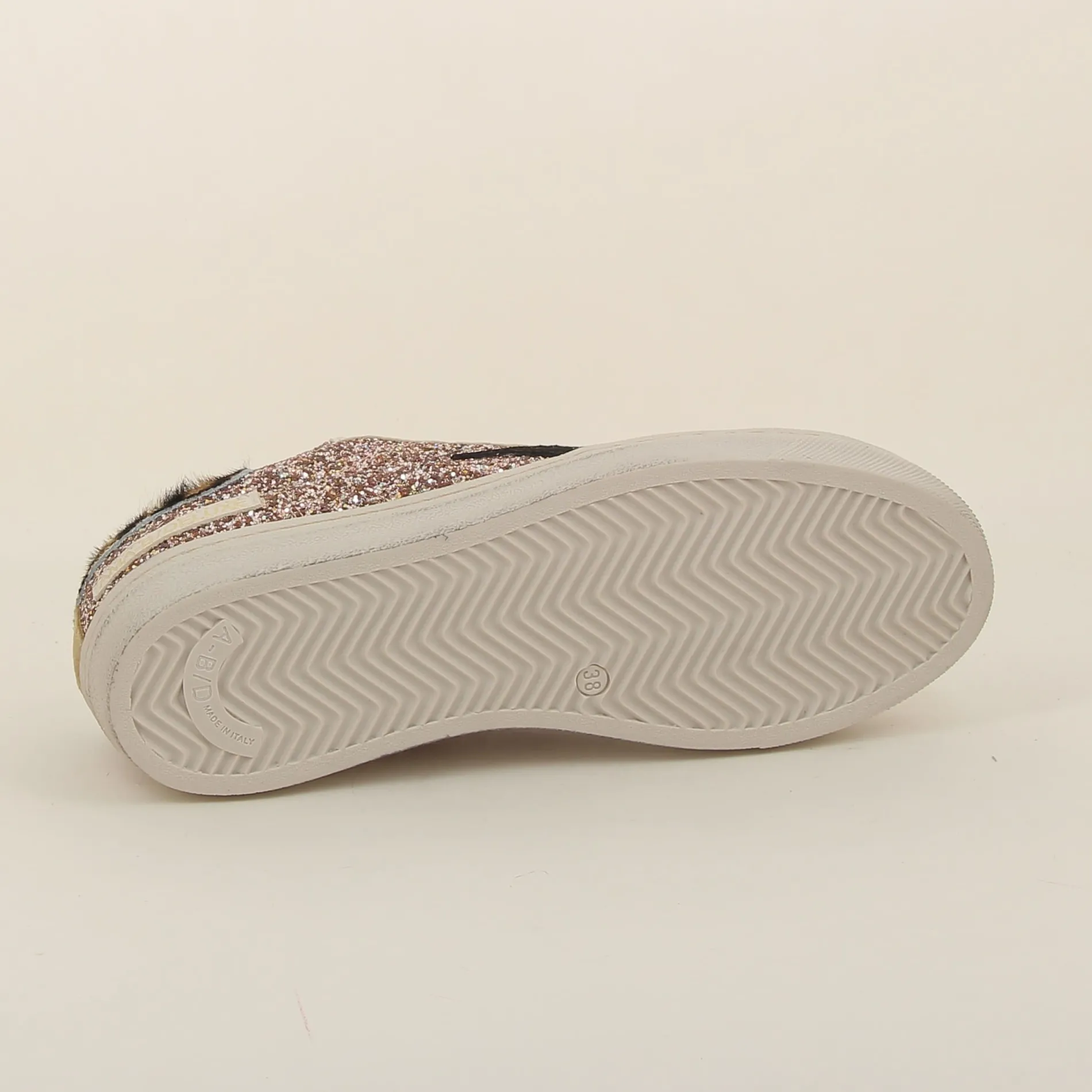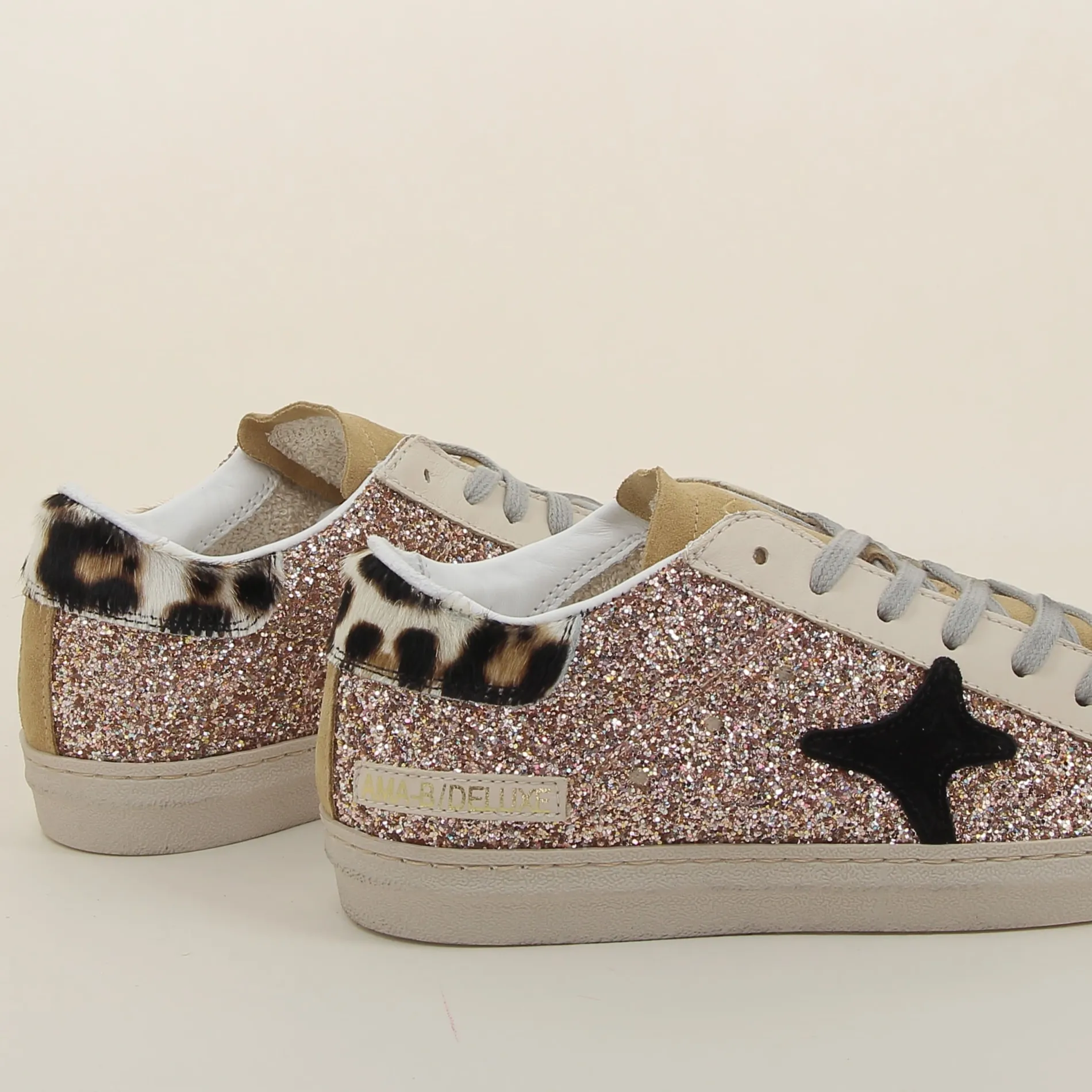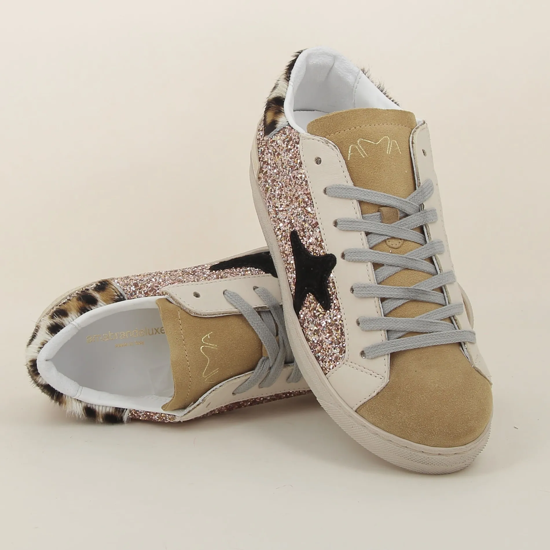 La Basket Ama-brand en glitter rose, avec ses détails en daim camel et cuir beige, est parfaite pour celles qui souhaitent allier confort, originalité, et éclat dans une chaussure au style inimitable.