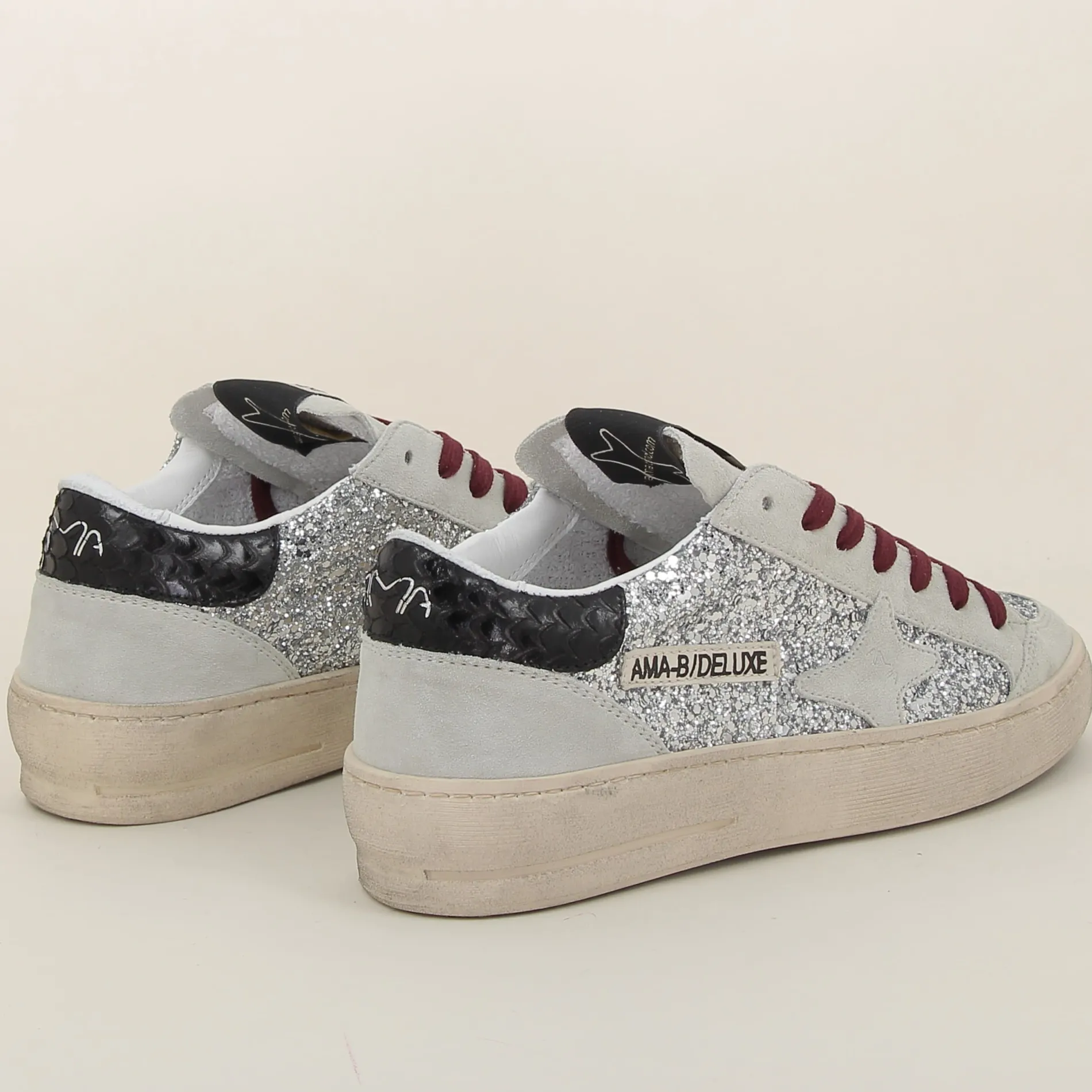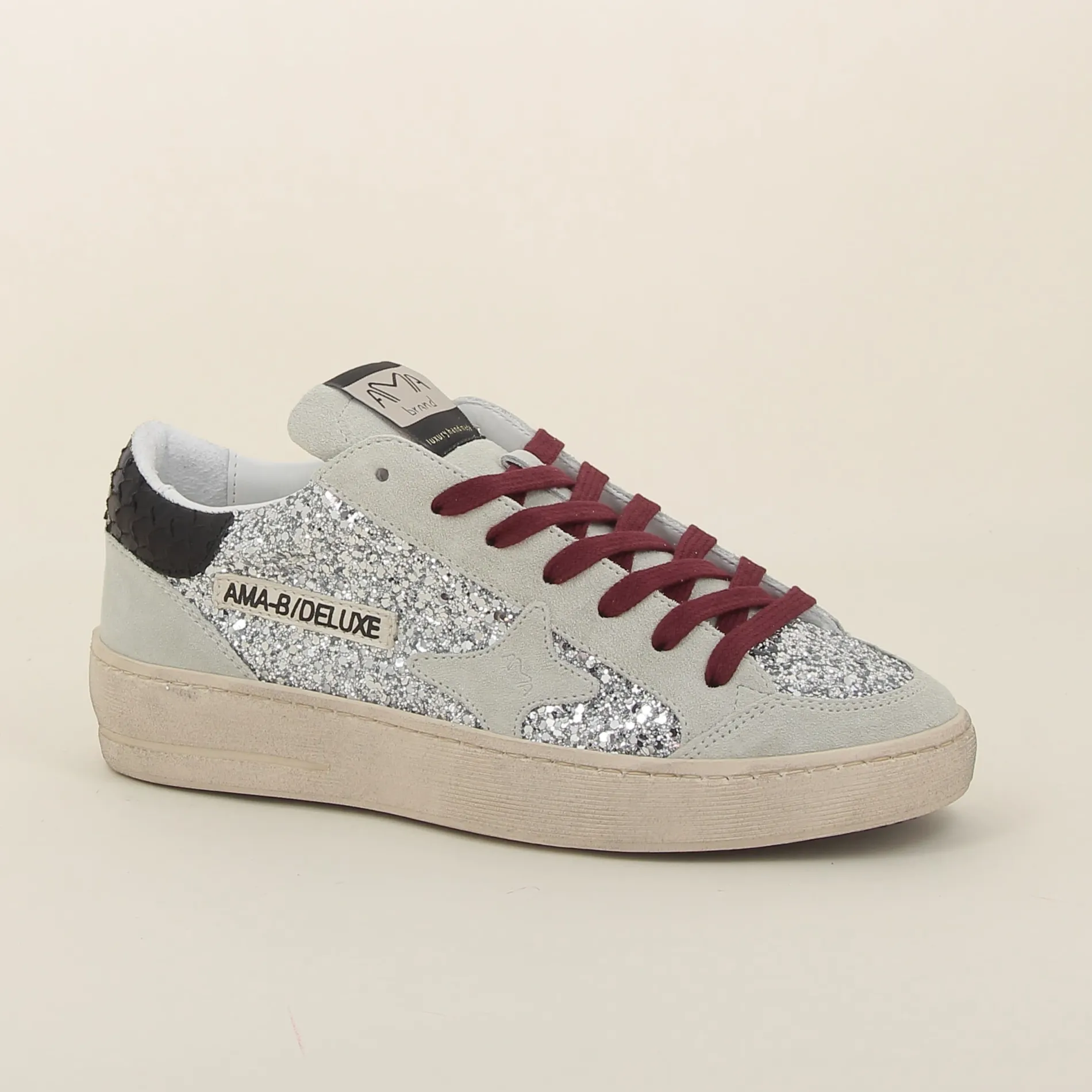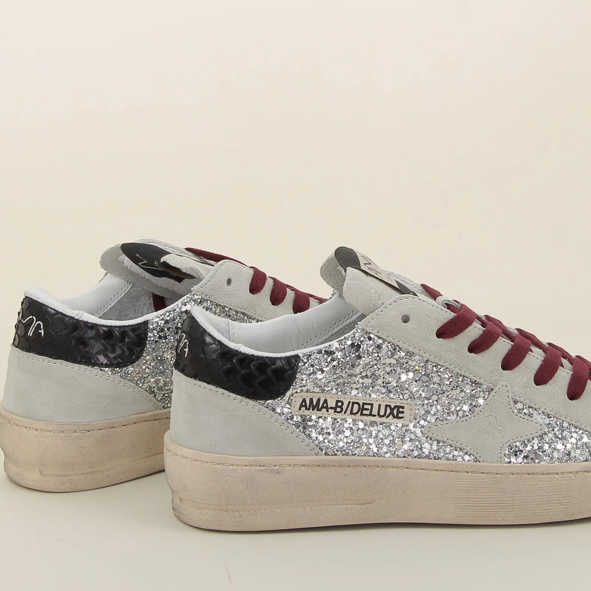 ★ Tige : Réalisée en glitter argenté, la tige de cette basket apporte une touche lumineuse et éclatante. L’empiècement en daim gris ajoute de la profondeur et une texture contrastée à l’ensemble.