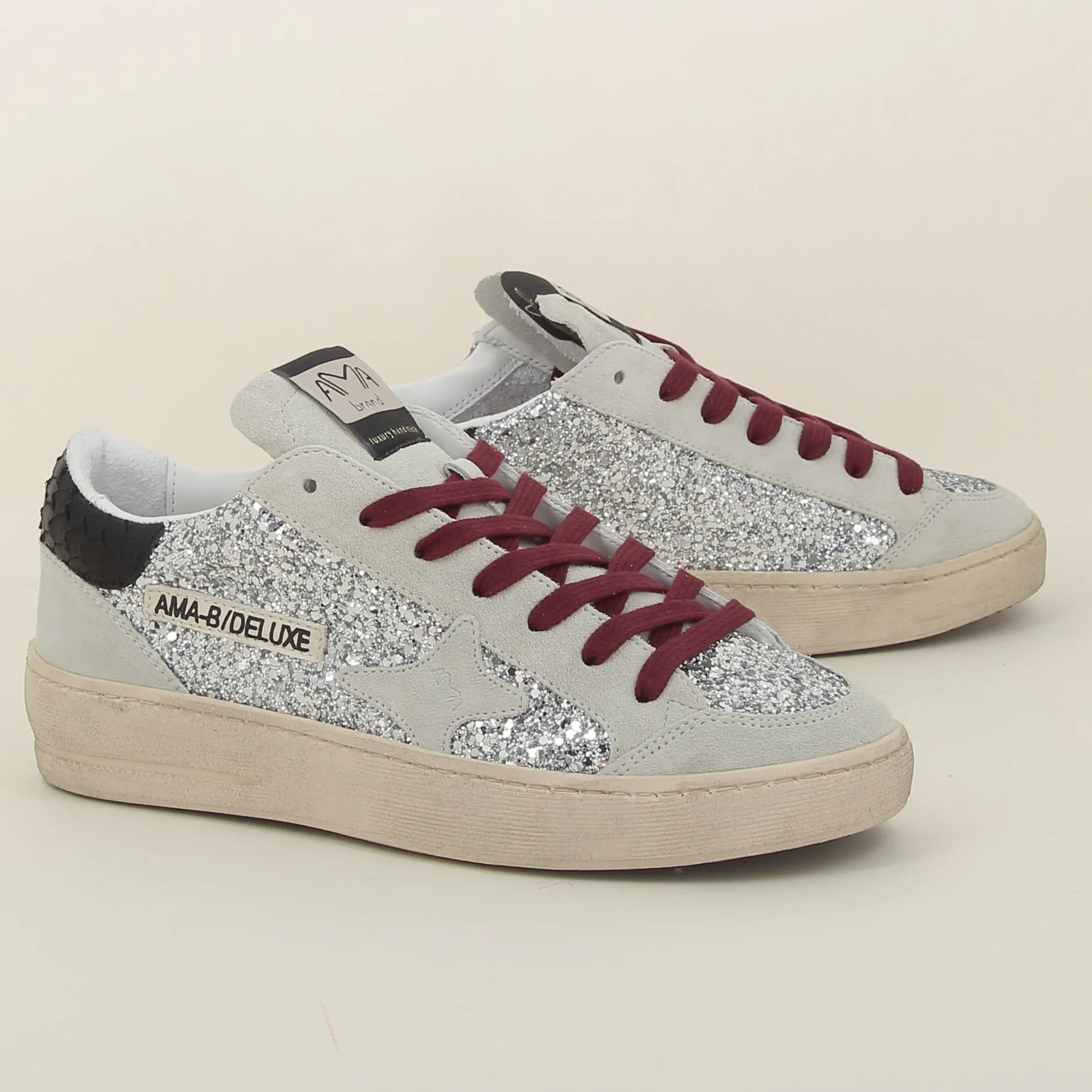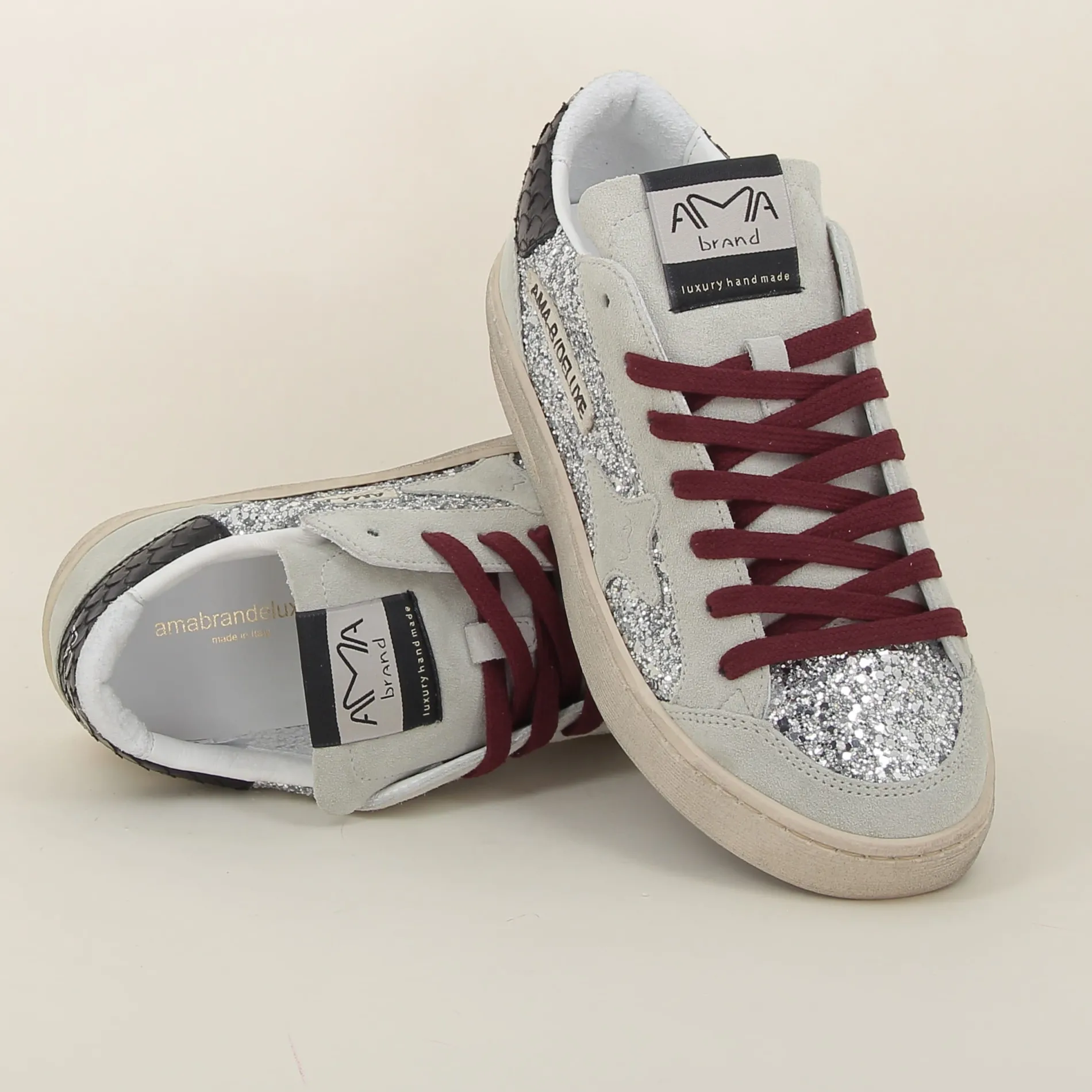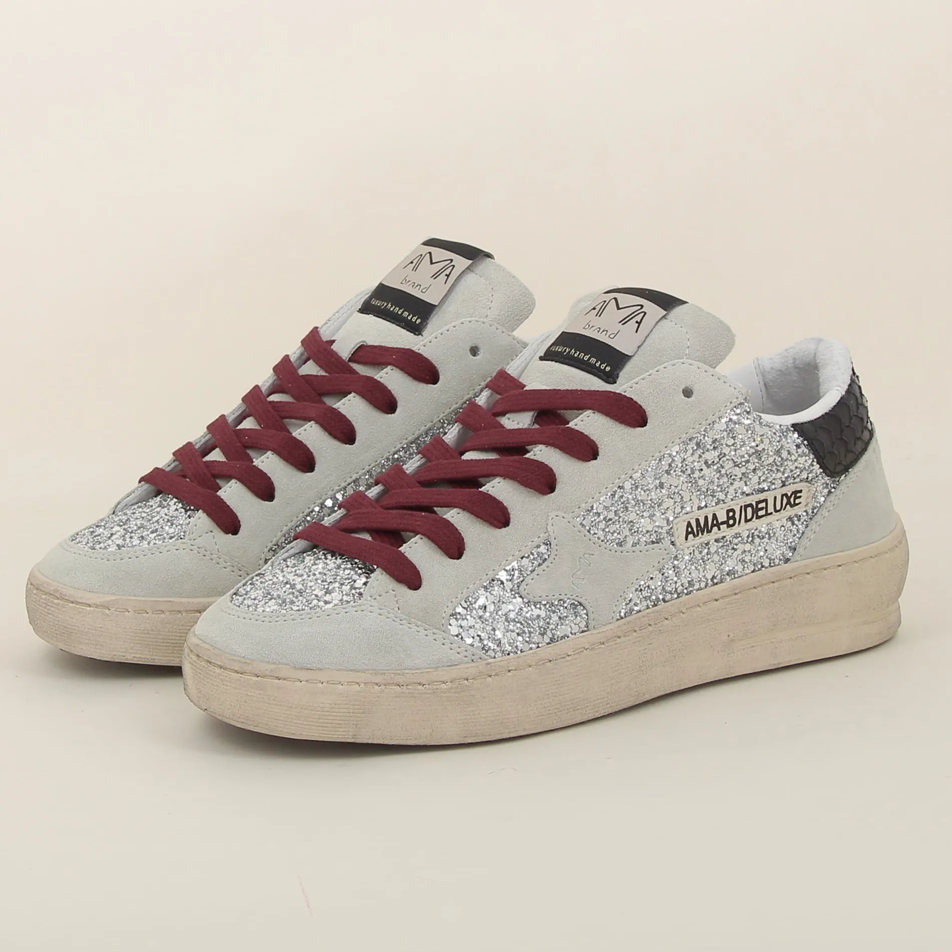 ★ Tige : Réalisée en glitter argenté, la tige de cette basket apporte une touche lumineuse et éclatante. L’empiècement en daim gris ajoute de la profondeur et une texture contrastée à l’ensemble.