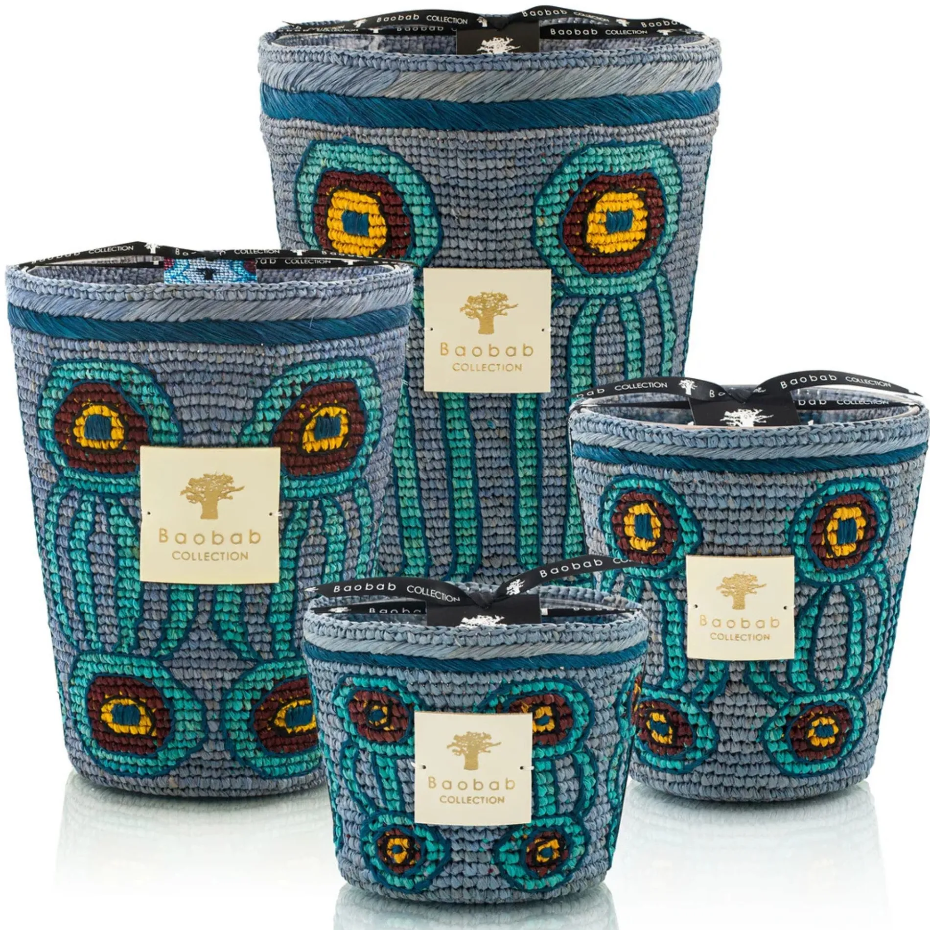 La bougie parfumée Ikaloy est recouverte d’un raphia aux camaïeux de bleus tissé à la main par une coopérative de femmes à Madagascar. Un motif tissé et brodé du signe aborigène représentant les sites sacrés, se répète tout autour de la bougie dans un effet graphique et contemporain. Elle porte le nom de la colline sacrée du premier roi de Madagascar.