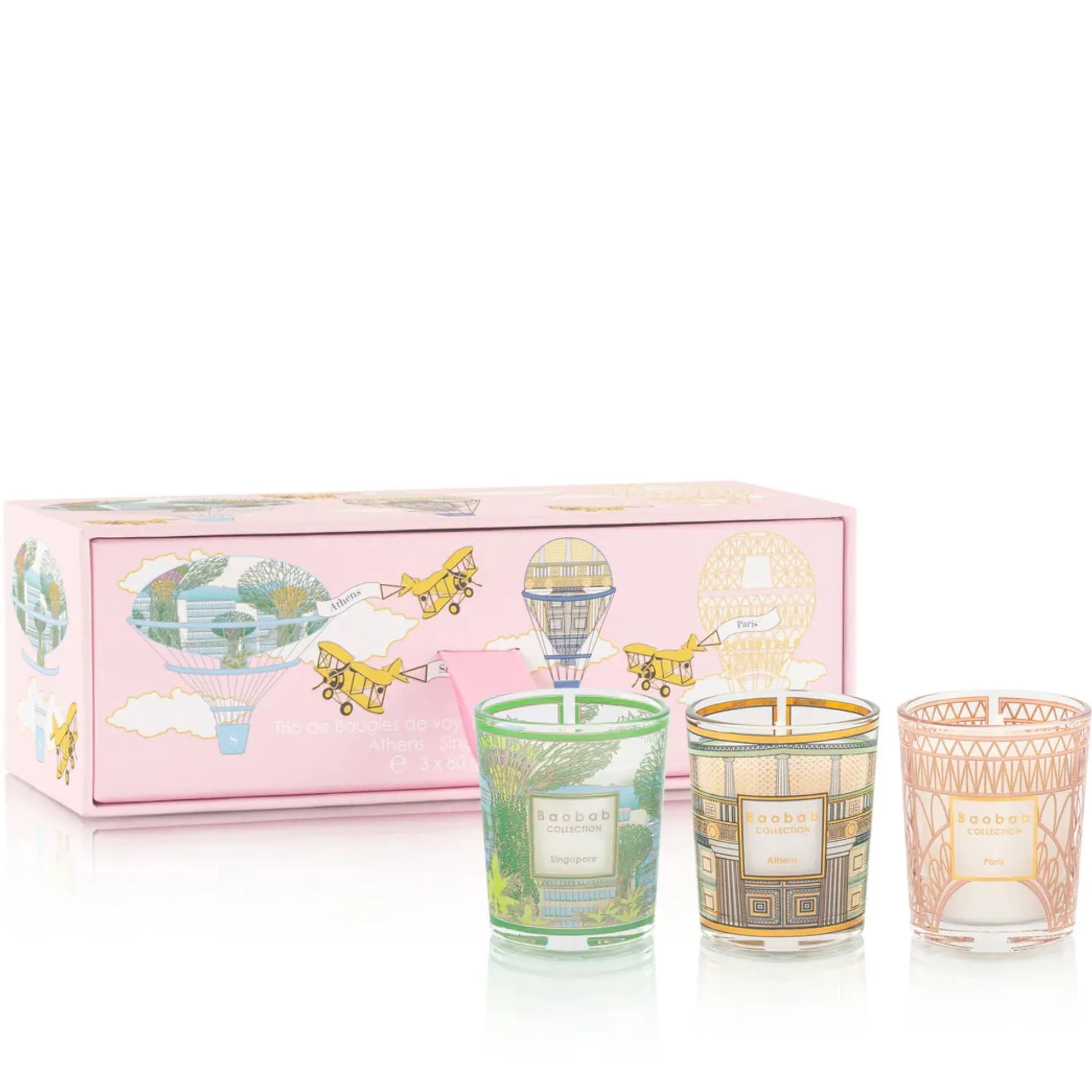 Découvrez notre trio de bougies de voyage. Une boite rose car le voyage se termine à Paris, la capitale romantique.
