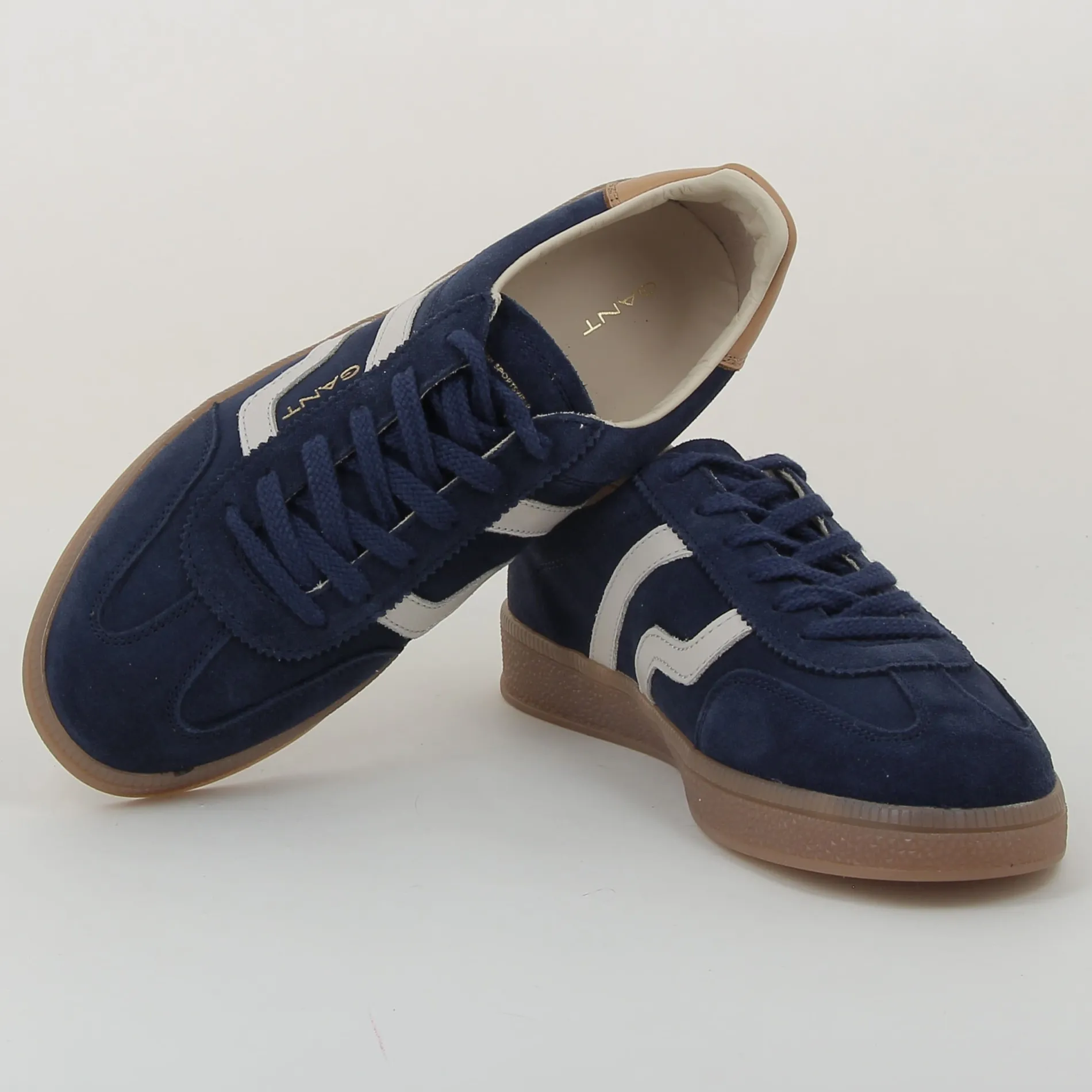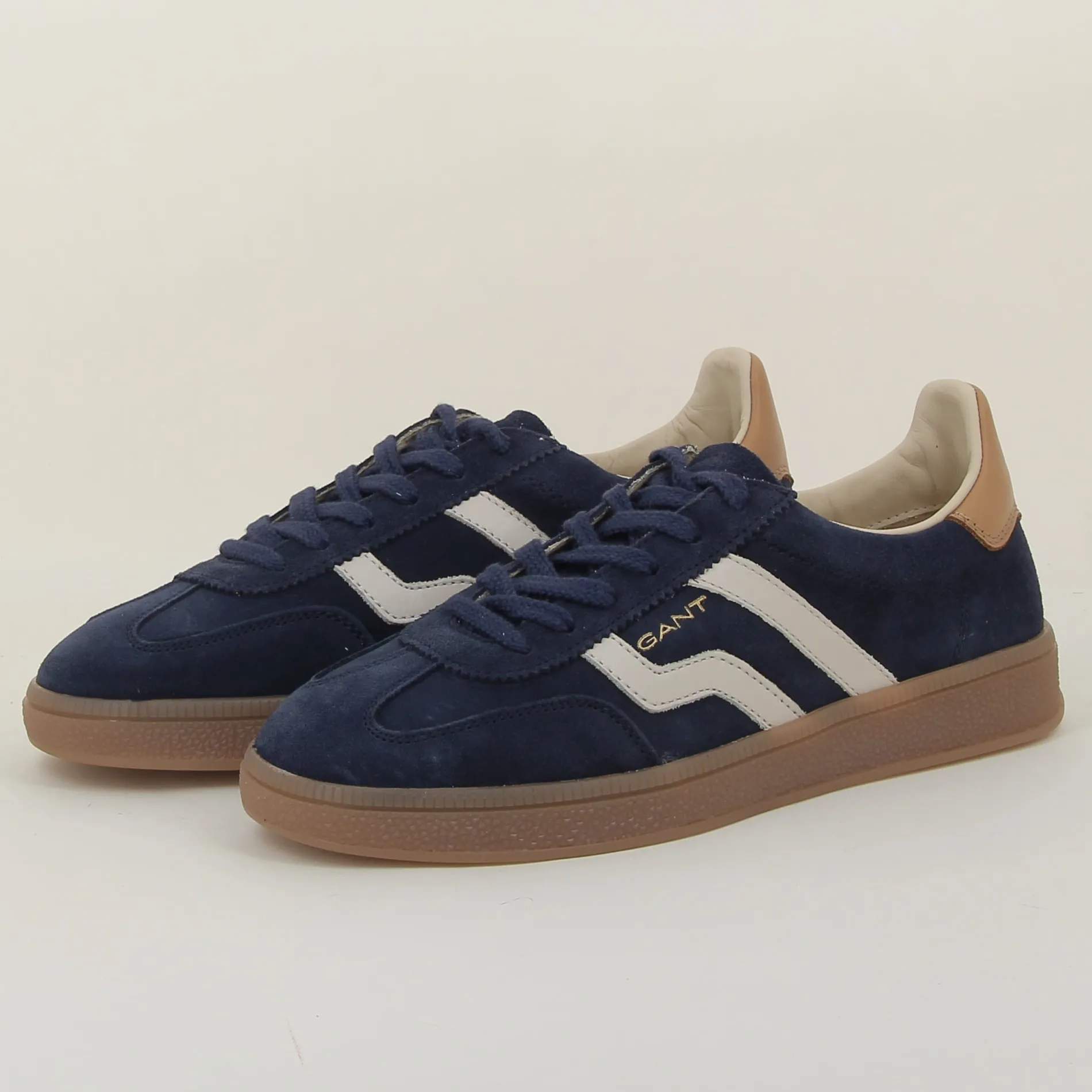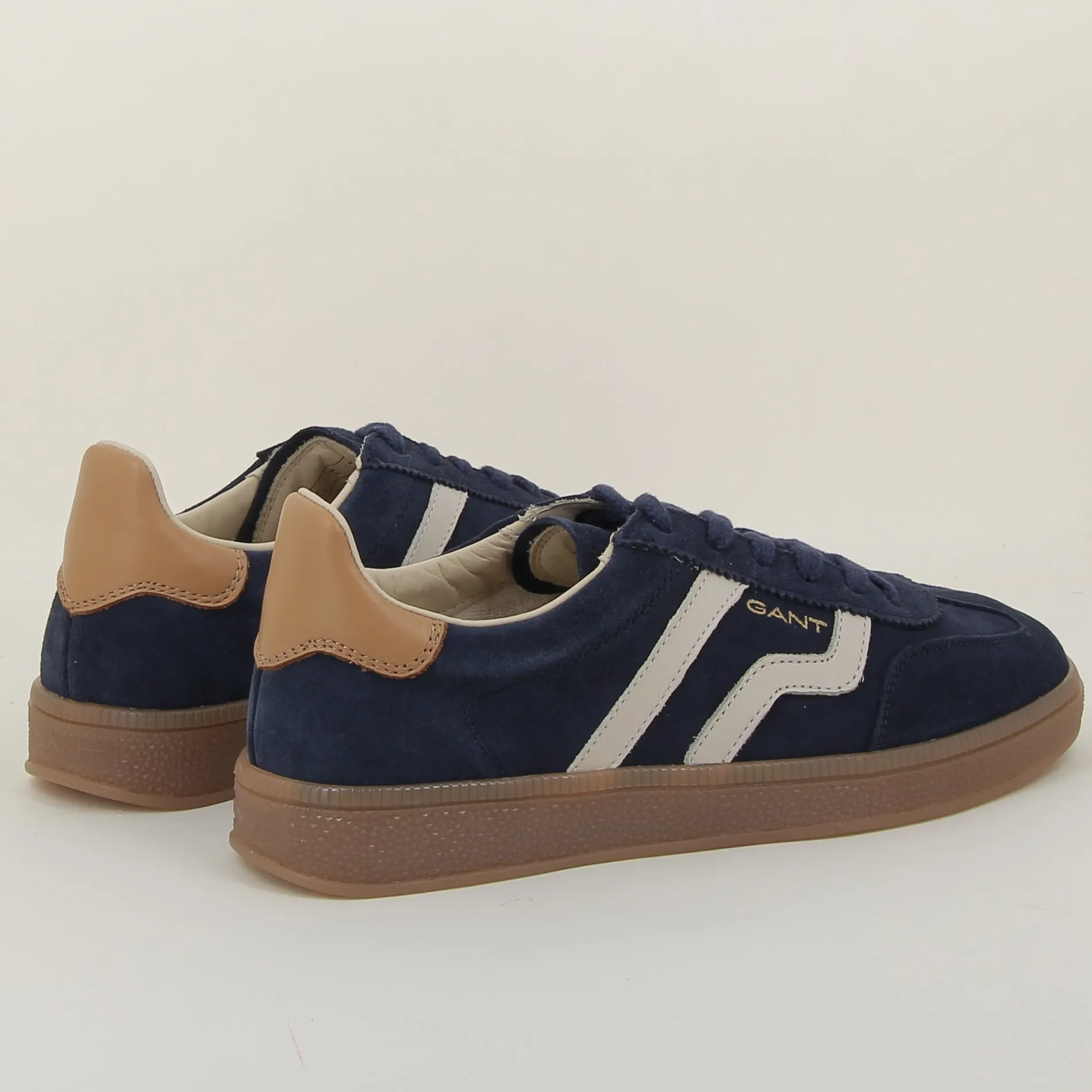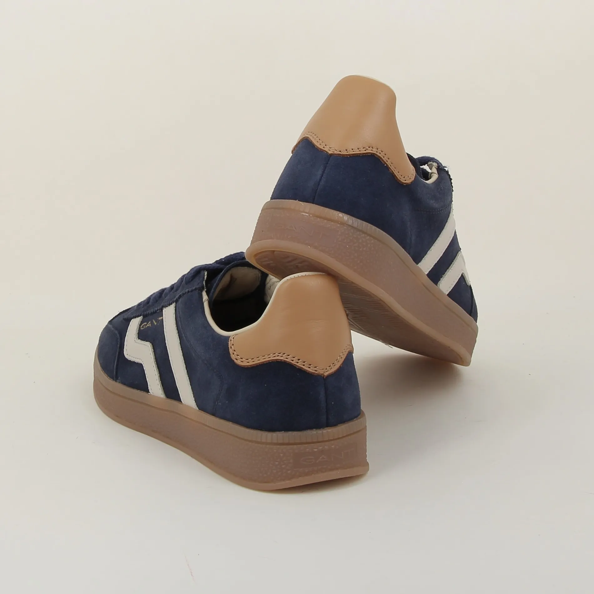 ★ Languette et Bout : La languette et le bout de la chaussure sont en daim bleu, conférant une touche de douceur et de texture. Le logo Gant doré sur le haut de la languette ajoute une finition élégante.