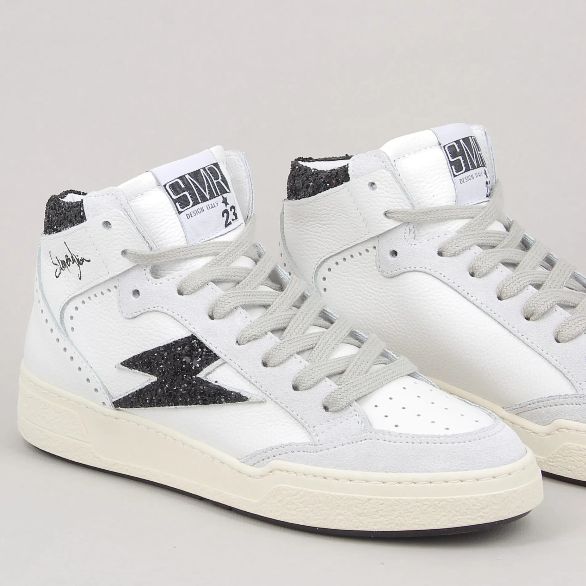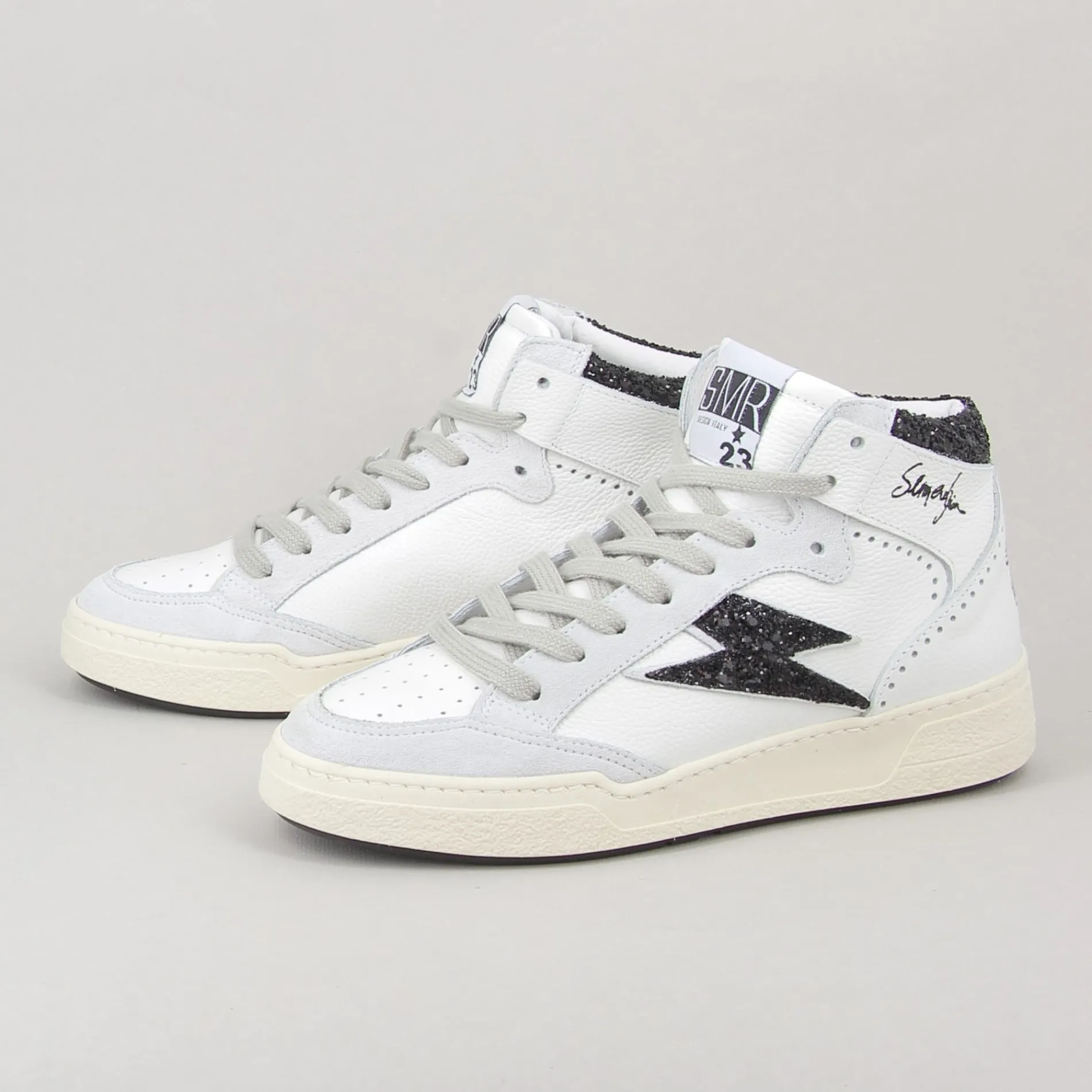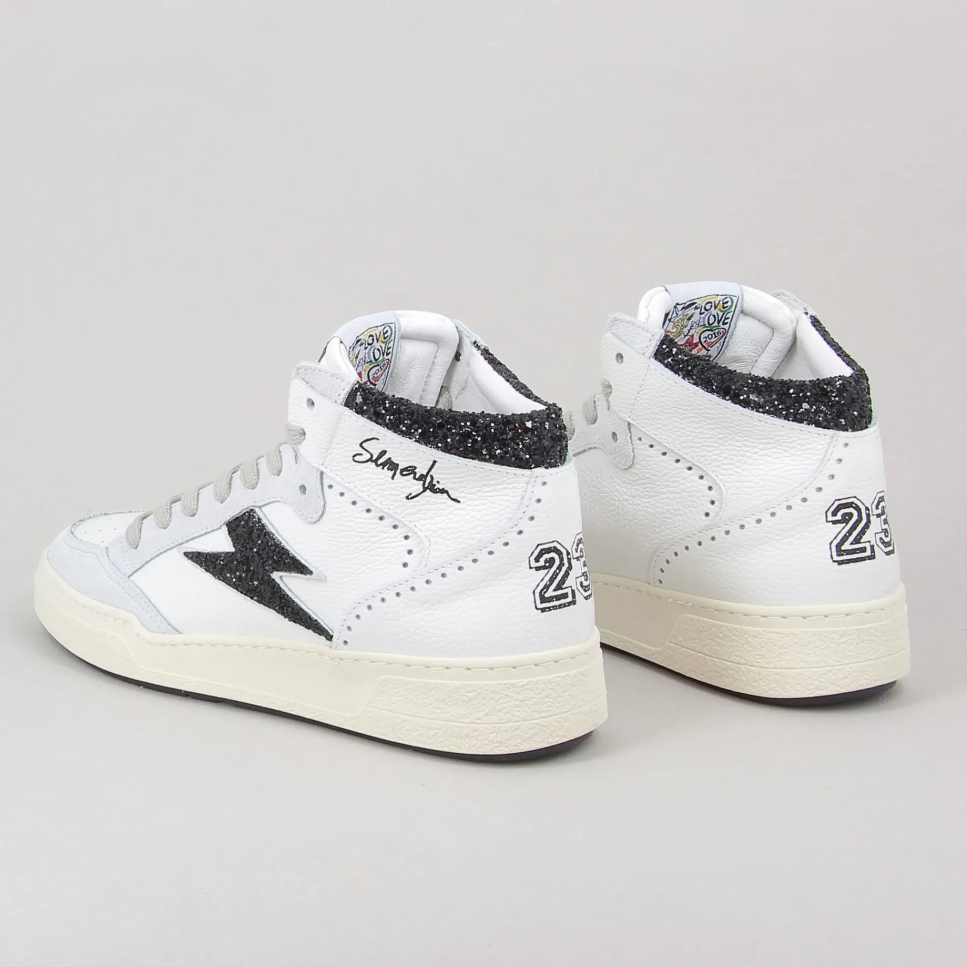 Les baskets montantes BRAGA de chez Semerdjian deviendront votre nouvelle paire de chaussures de prédilection. Si elles sont si incontournables, c’est parce qu’elles sont aussi tendance que faciles à marier. Réalisées en cuir blanc, elles affichent des empiècements en daim gris et un éclair signature en glitter noir. Cette paire est relevée du chiffre 23 sur l’arrière de la paire, clin d’oeil à la marque.