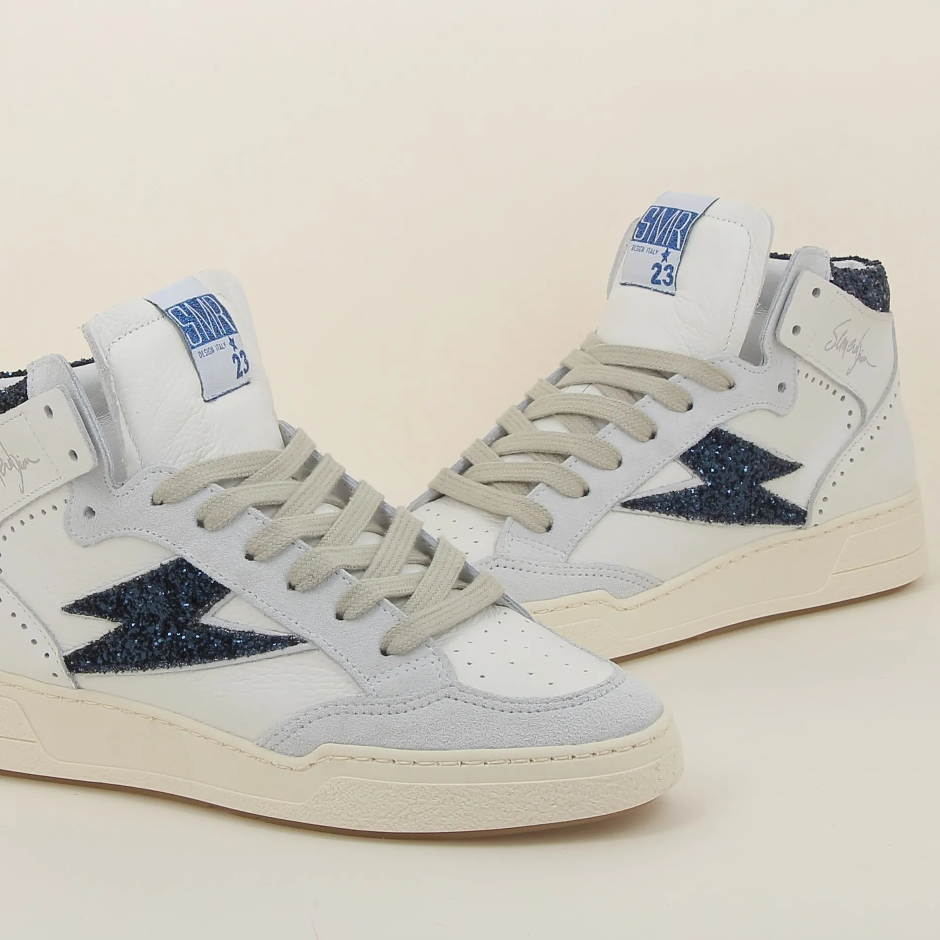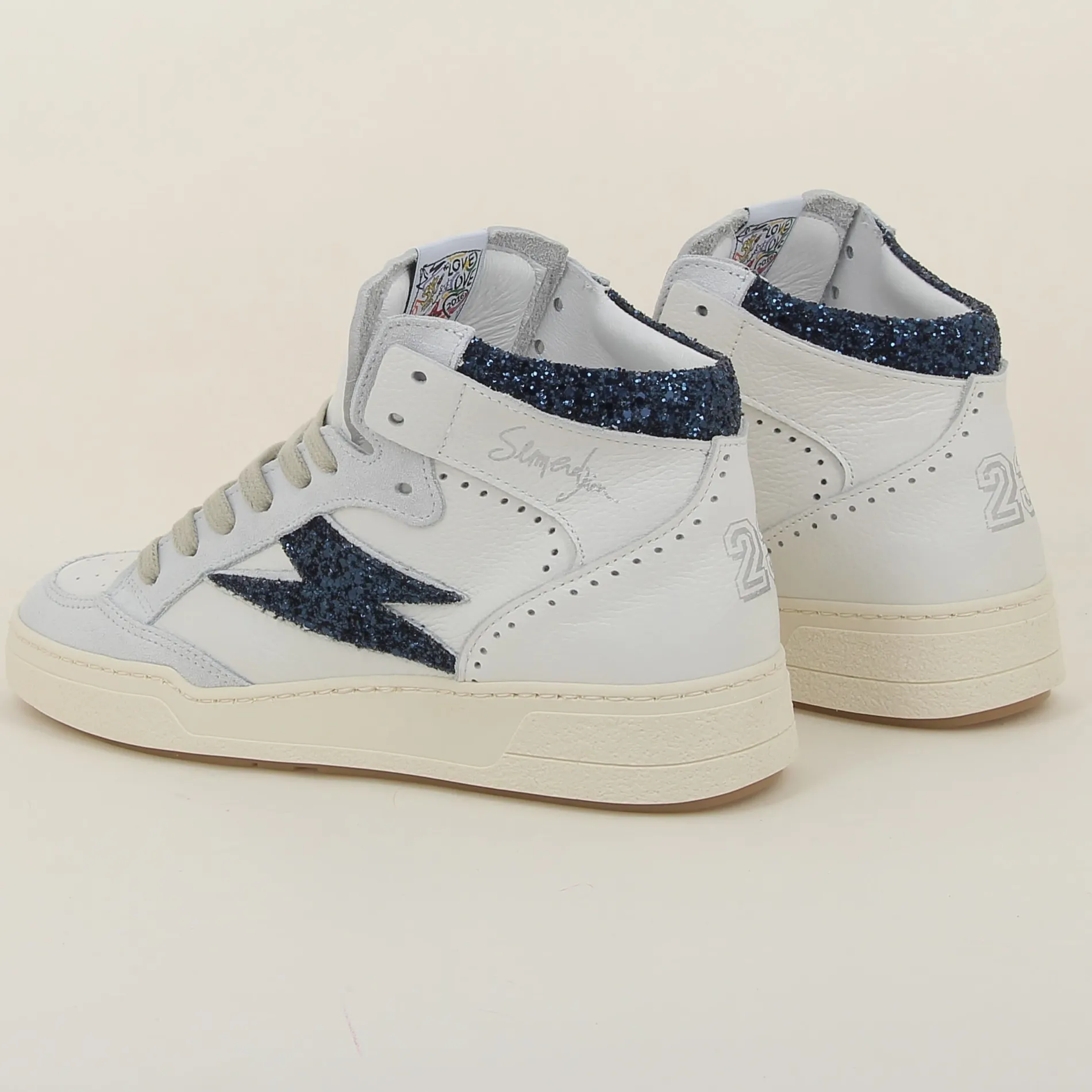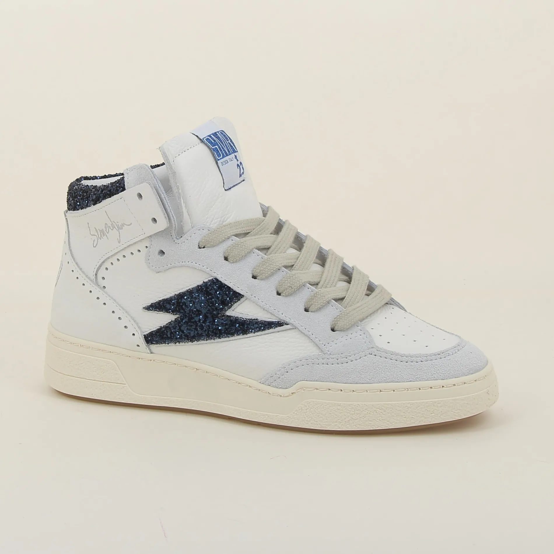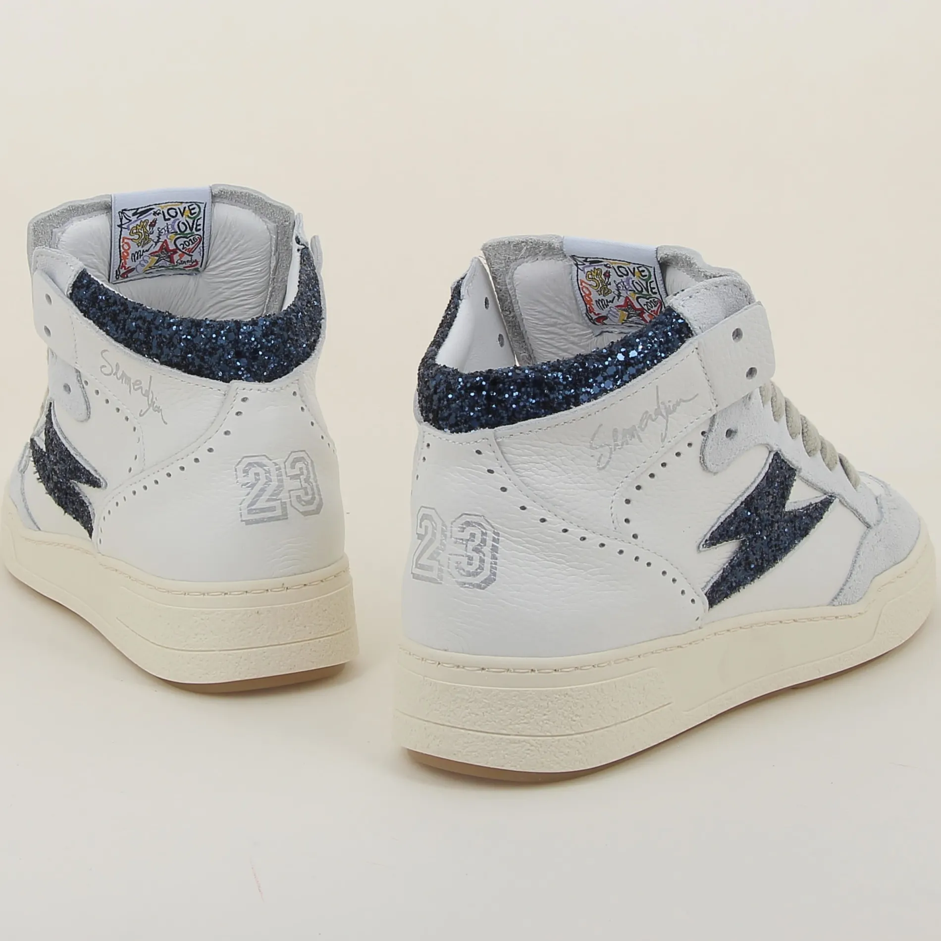 ★ Détail latéral : Éclair signature en glitter bleu marine, ajoutant une touche distinctive et texturée.