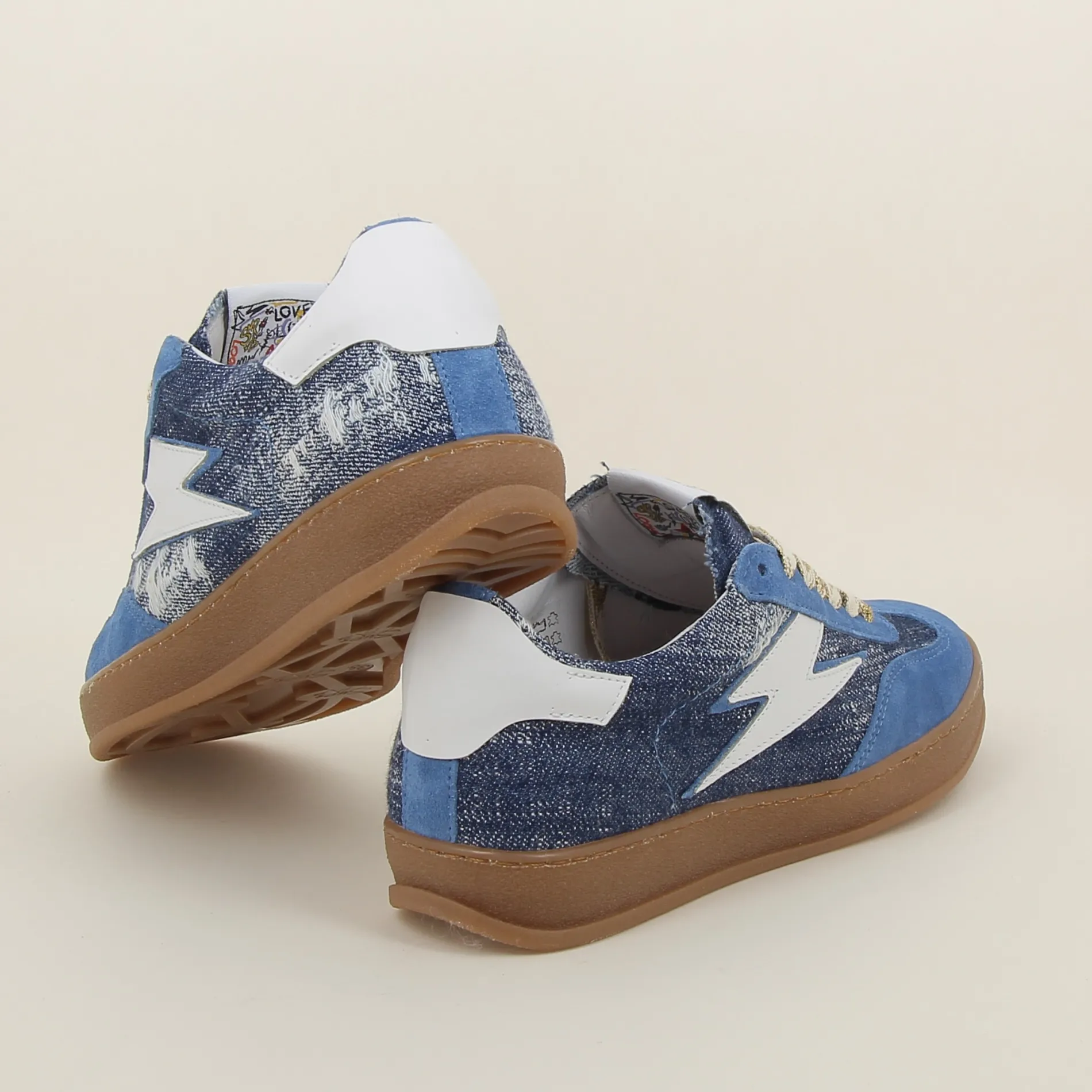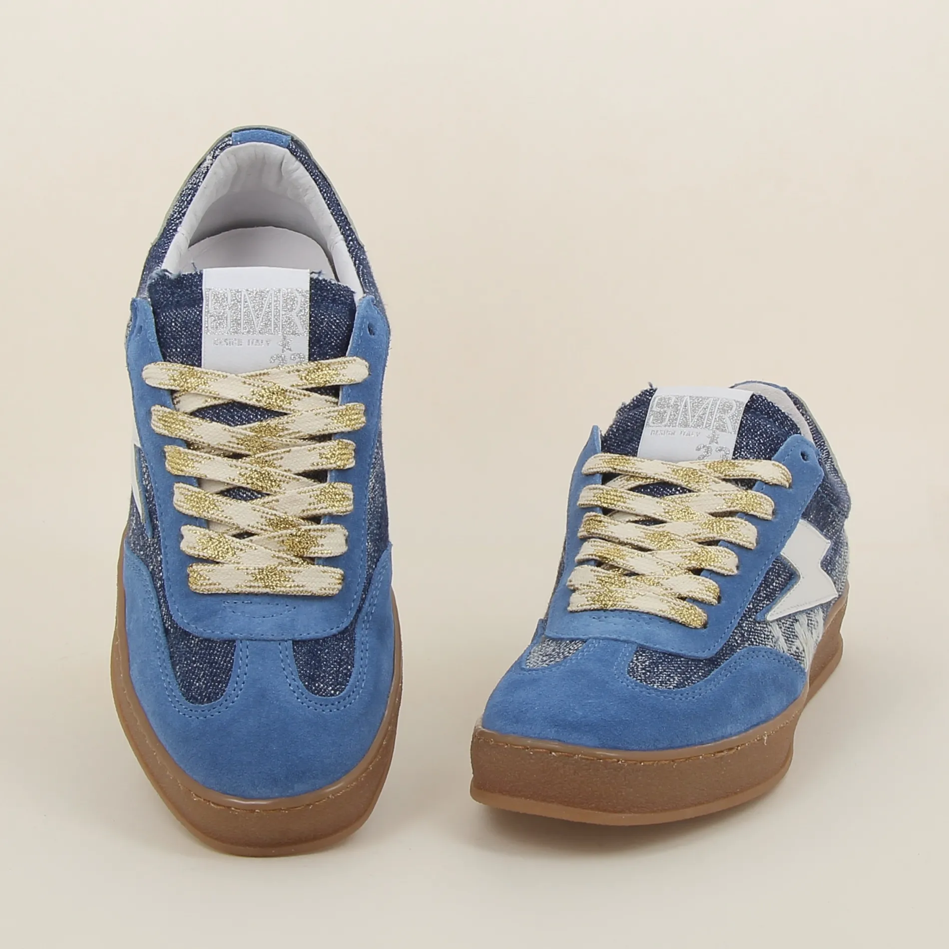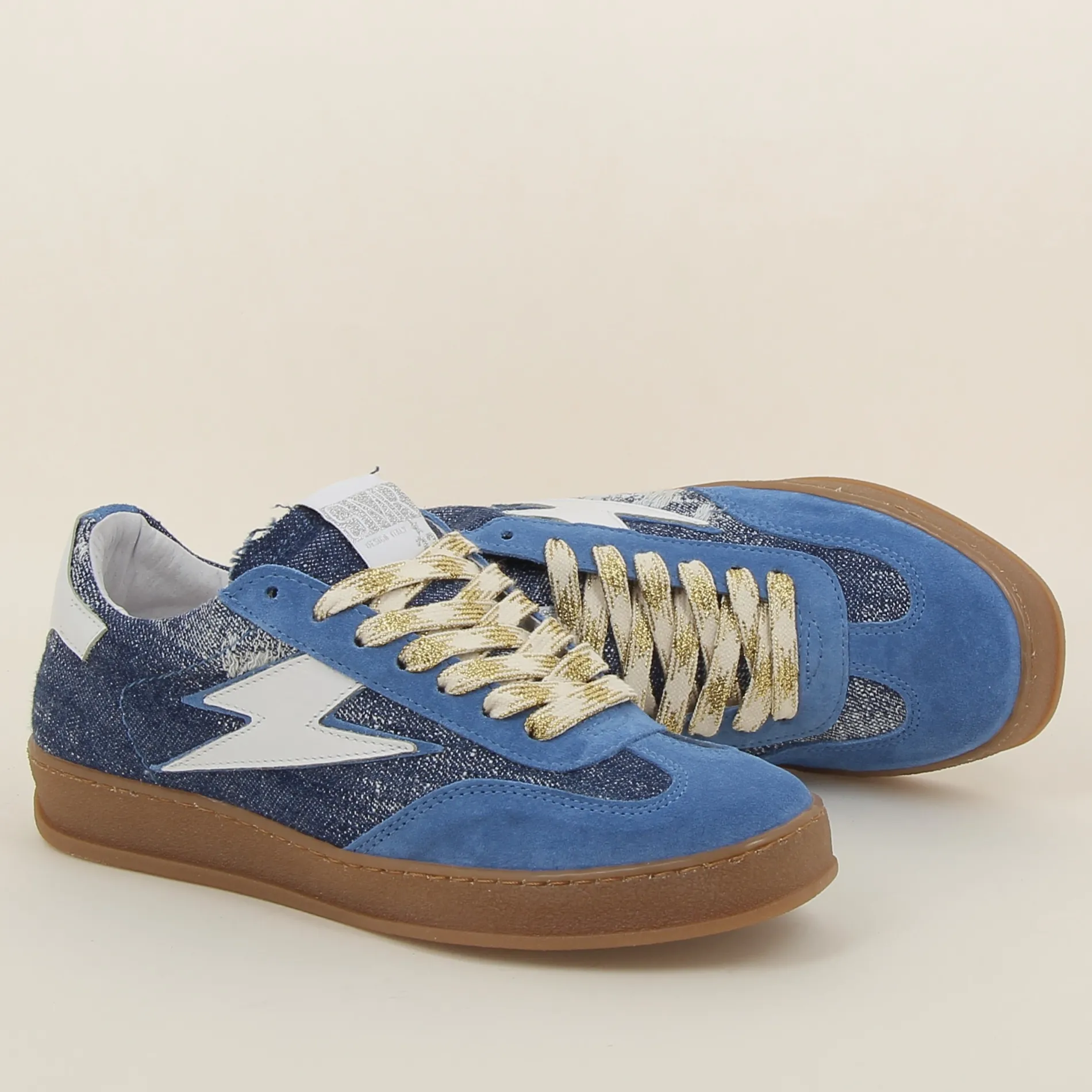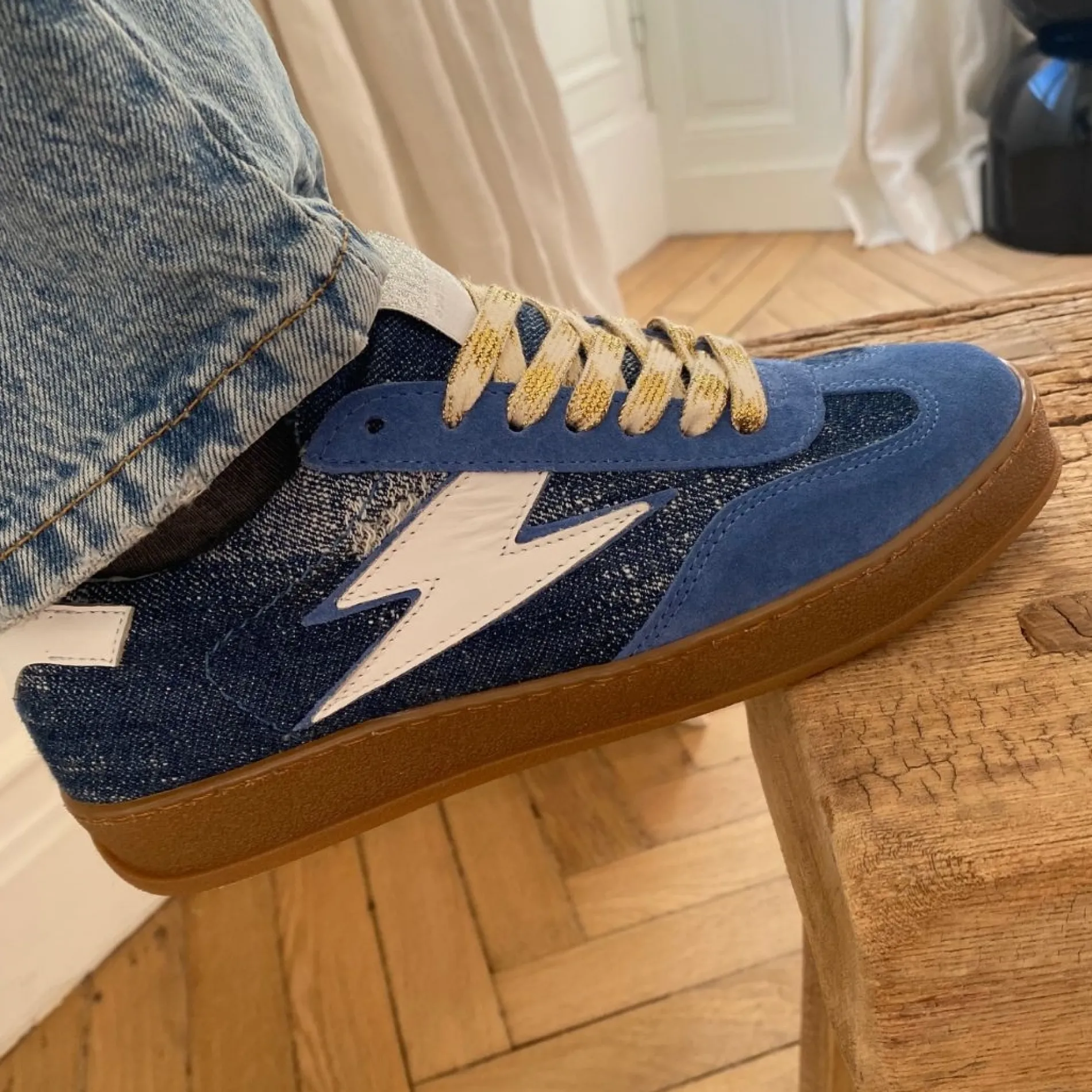 Le modèle RISY de chez Semerdjian est une basket basse de couleur bleue, fabriquée en croûte de cuir avec des empiècements en jean et une semelle en gomme de couleur miel. La languette est perforée pour un style unique.