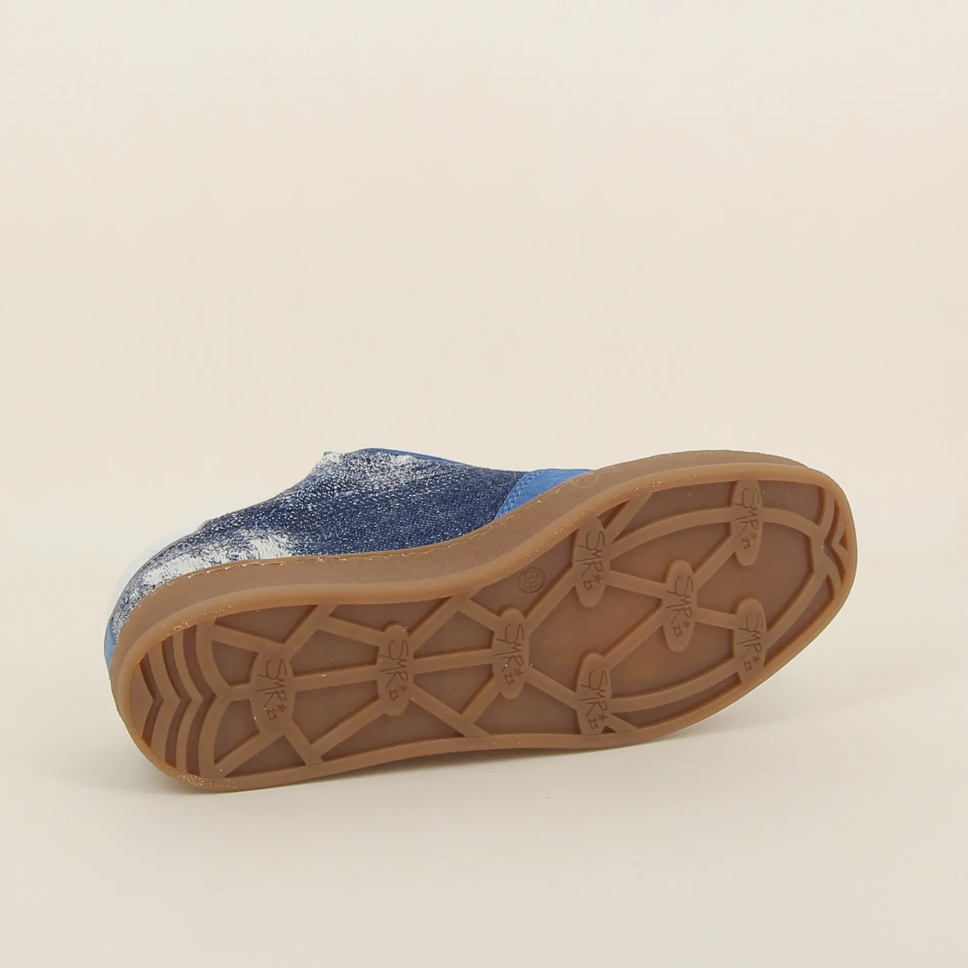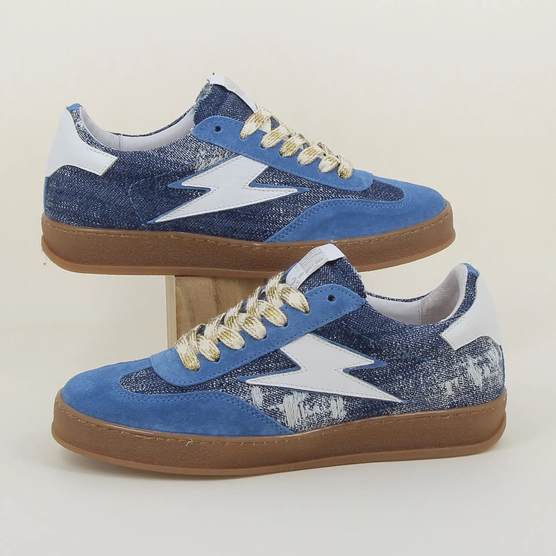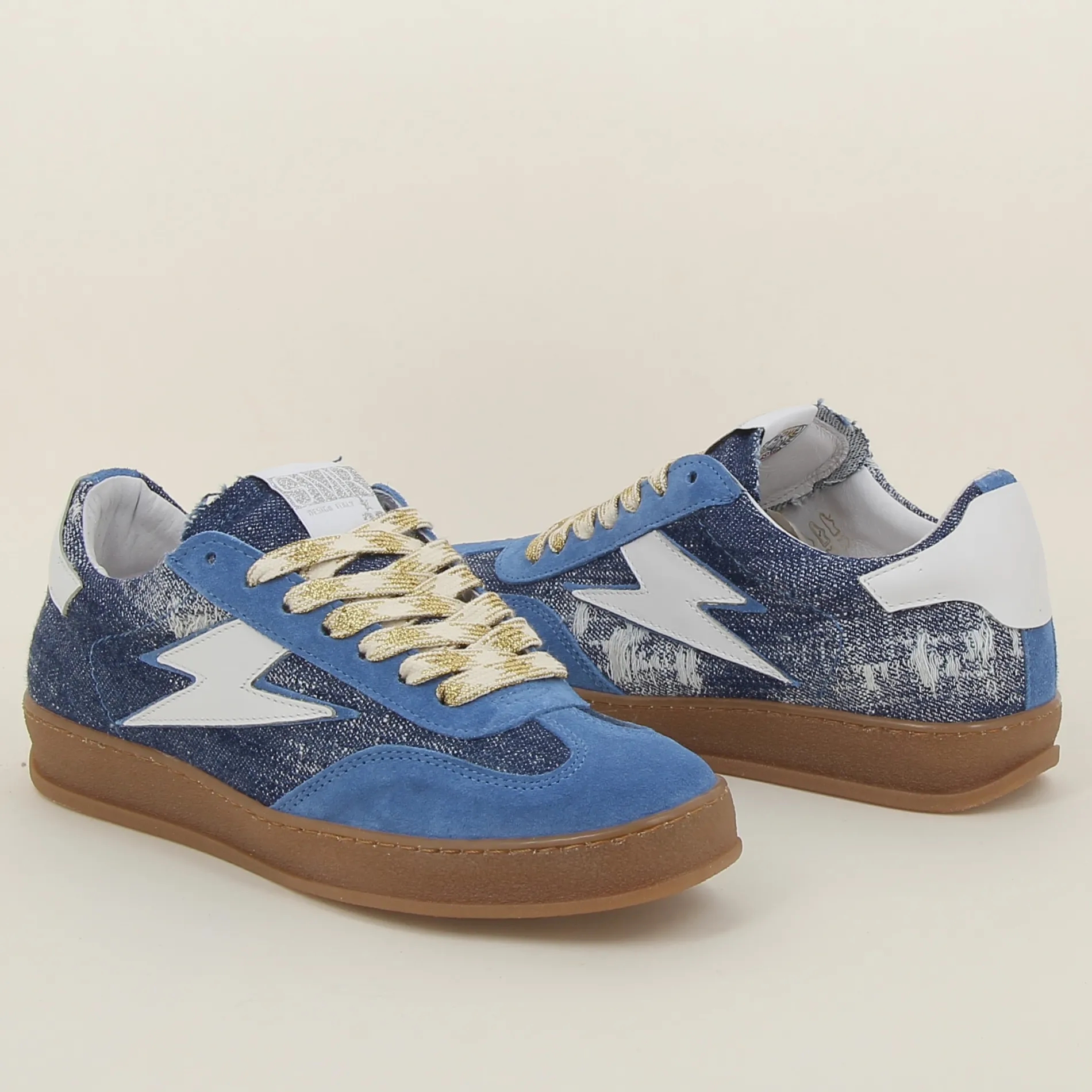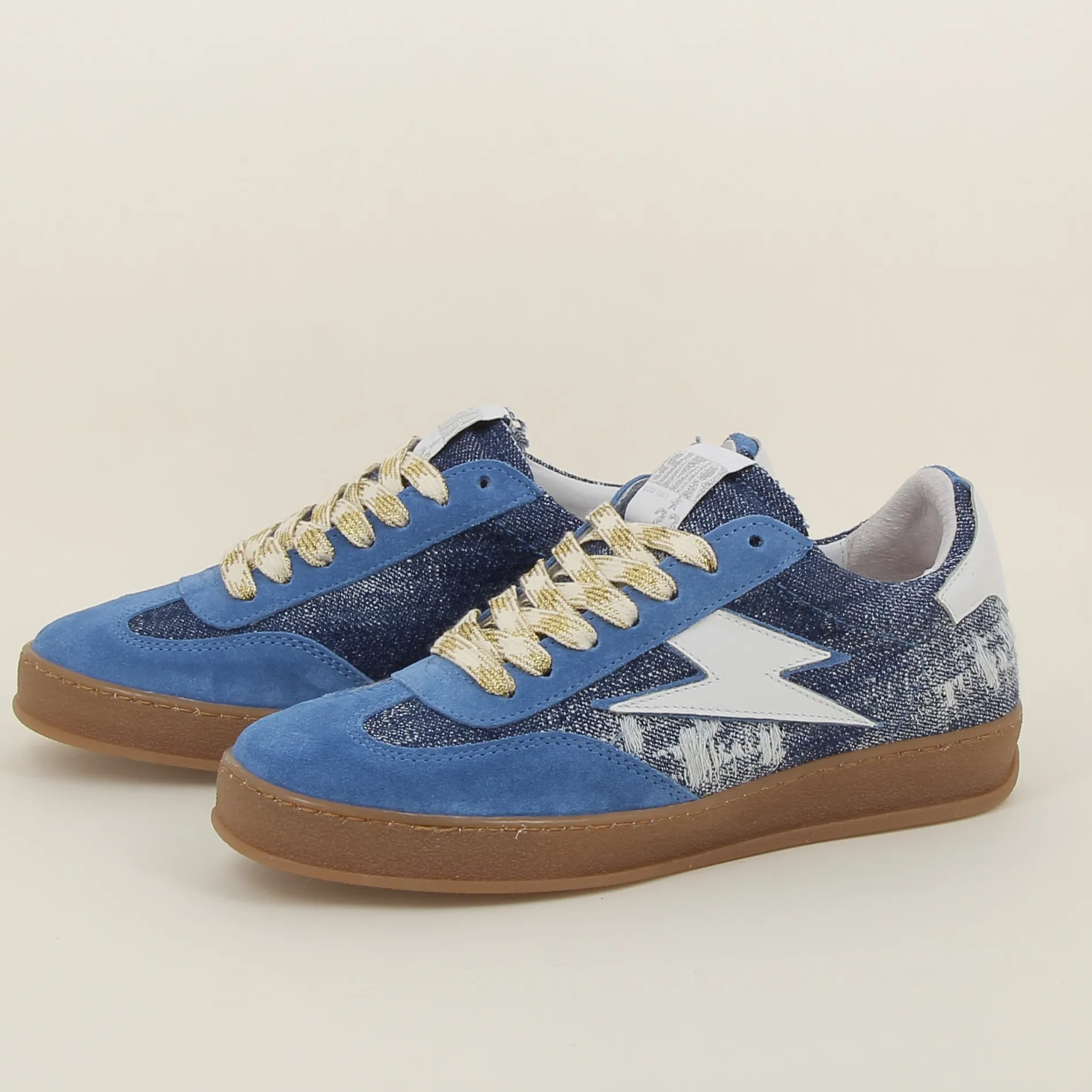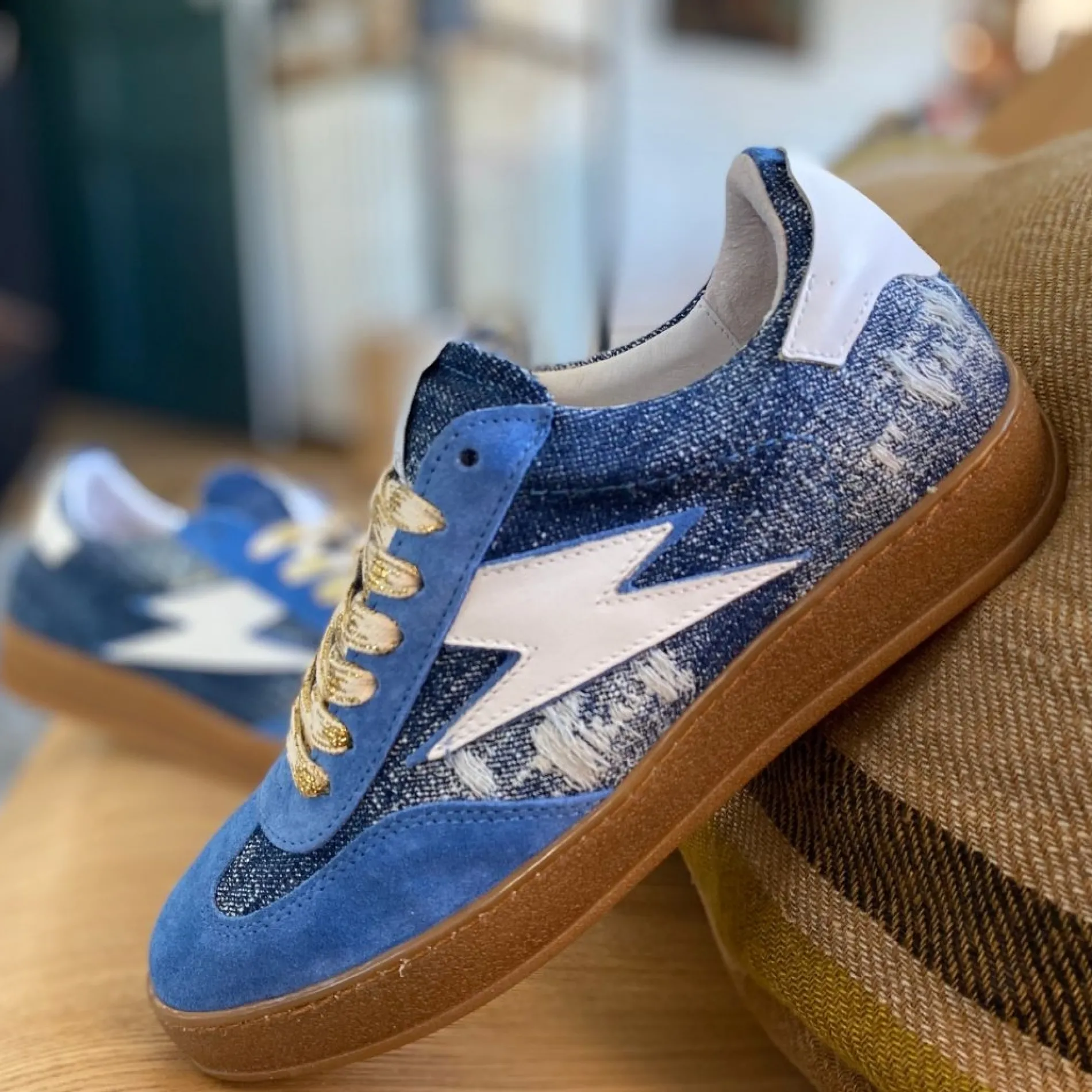 Le modèle RISY de chez Semerdjian est une basket basse de couleur bleue, fabriquée en croûte de cuir avec des empiècements en jean et une semelle en gomme de couleur miel. La languette est perforée pour un style unique.