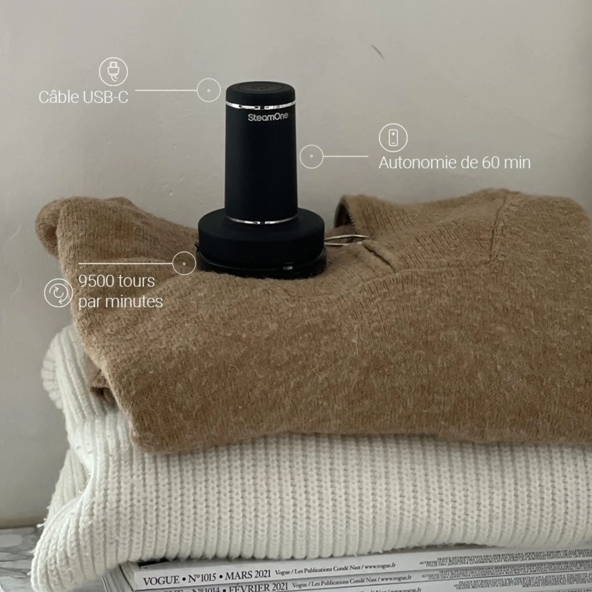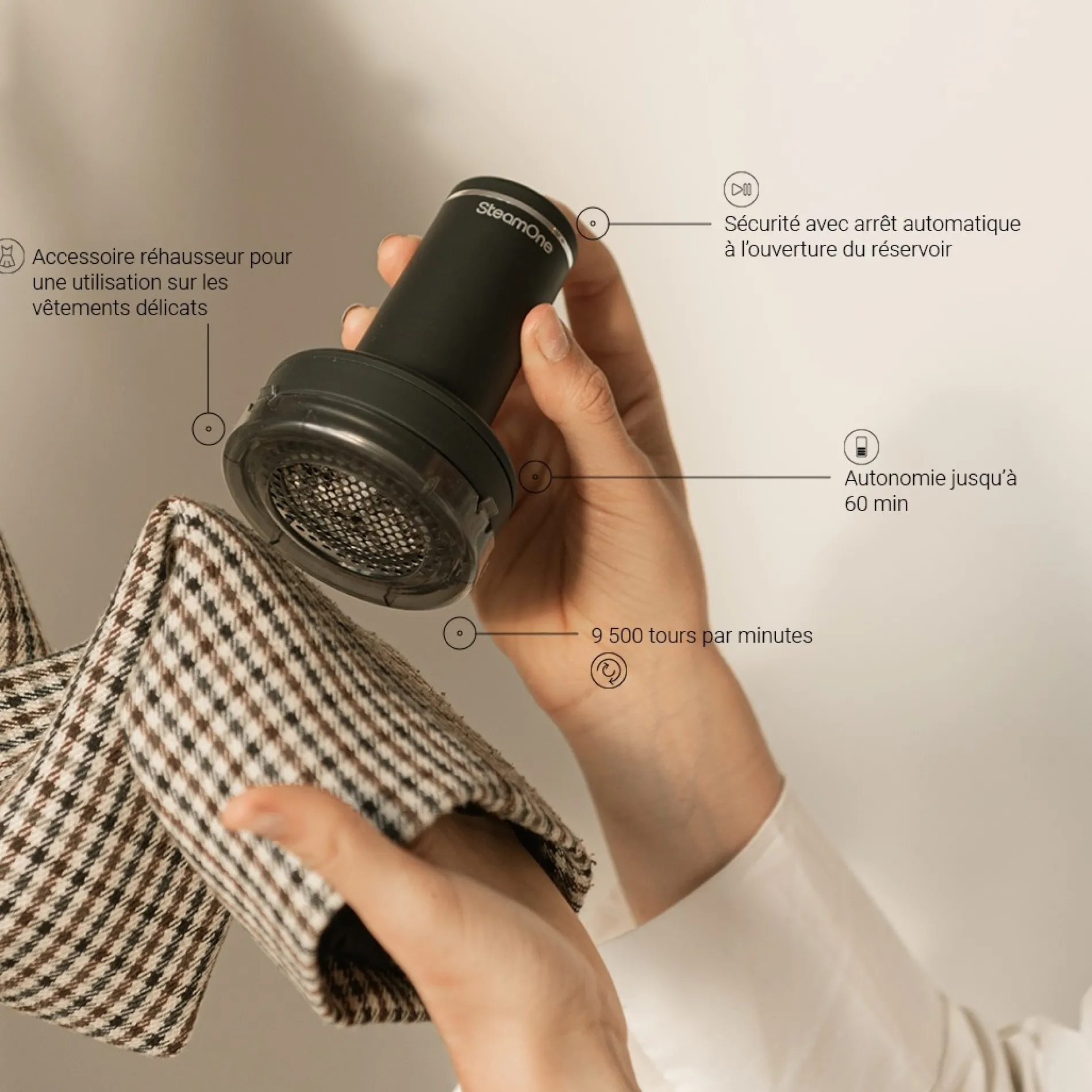 Rechargeable, facile à manipuler et simple à utiliser, il a été conçu par SteamOne pour enlever facilement les peluches de tous les types de tissus.